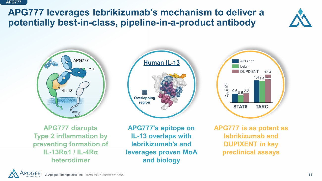 10 © Apogee Therapeutics, Inc. 0 2 4 6 8 10 12 14 16 18 20 22 24 65 55 70 50 75 45 80 60 85 40 90 35 95 30 100 0 Amlitelimab Rocatinlimab Dupilumab Nemolizumab CBP - 201 Tralokinumab Lebrikizumab Dosing Interval (weeks) Apogee is pursuing potentially best - in - class monotherapy and first - in - class combination in AD NOTE: *Positioning of Apogee programs is illustrative and based on interim Phase 1 results for APG777 only and illustrates wh at we believe we can potentially achieve. Only DUPIXENT and ADBRY are approved. SOURCE: 1. Lebrikizumab 250mg Q2W Ph3 avg. Silverberg JI et al. AAD 2022 2. Dupilumab 300 mg Q2W mono Ph3 avg. DUPIXENT USPI 3. Tralokinumab 300 mg Q2W mono Ph3 avg. Adbry USPI 4. CBP - 201 300 mg Q2W Ph2. Connect Biopharma Press Release Jan. 5, 2022 5. Nemolizumab 30 mg Q4W Ph3 avg. Silverberg J et al EADV 2023 6. Rocatinlimab 150mg Q4W Ph2b Guttman - Yassky E et al Lancet 2023 7. Amlitelimab 250mg Q4W Ph2b Weidinger S et al EADV oral presentation 2023. Efficacy data are derived from different clinical trials at different points in time, wi th differences in trial design and patient populations. As a result, cross - trial comparisons cannot be made, and no head - to - head clinical trials have been conducted. Efficacy (EASI - 75, %) Testing ~30 - 40% higher exposures than lebrikizumab in induction Potential for every 3 - or 6 - month maintenance dosing APG777* Potential first - in - class IL - 13 + OX40L combination APG777 + APG990* Potential for best - in - class efficacy APG777
