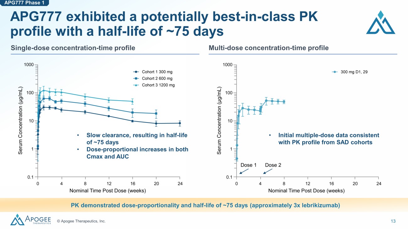 11 © Apogee Therapeutics, Inc. APG777 leverages lebrikizumab's mechanism to deliver a potentially best - in - class, pipeline - in - a - product antibody 0.6 1.4 0.5 0.6 STAT6 TARC 13.4 IC 90 (nM) APG777 Lebri DUPIXENT Overlapping region Human IL - 13 APG777's epitope on IL - 13 overlaps with lebrikizumab’s and leverages proven MoA and biology APG777 is as potent as lebrikizumab and DUPIXENT in key preclinical assays NOTE: MoA = Mechanism of Action. APG777 disrupts Type 2 inflammation by preventing formation of IL - 13R α1 / IL - 4R α heterodimer 1.4 APG777