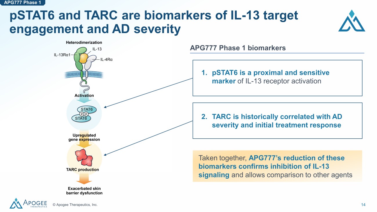 13 © Apogee Therapeutics, Inc. APG777 exhibited a potentially best - in - class PK profile with a half - life of ~75 days • Slow clearance, resulting in half - life of ~75 days • Dose - proportional increases in both Cmax and AUC PK demonstrated dose - proportionality and half - life of ~75 days (approximately 3x lebrikizumab ) • Initial multiple - dose data consistent with PK profile from SAD cohorts Multi - dose concentration - time profile Single - dose concentration - time profile APG777 Phase 1 Dose 1 Dose 2