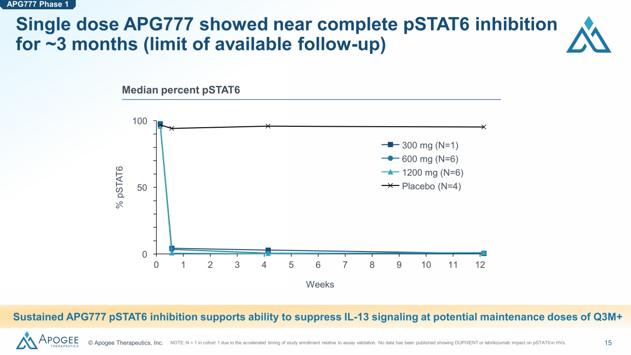 14 © Apogee Therapeutics, Inc. pSTAT6 and TARC are biomarkers of IL - 13 target engagement and AD severity 1. pSTAT6 is a proximal and sensitive marker of IL - 13 receptor activation APG777 Phase 1 biomarkers Taken together, APG777’s reduction of these biomarkers confirms inhibition of IL - 13 signaling and allows comparison to other agents 2. TARC is historically correlated with AD severity and initial treatment response APG777 Phase 1
