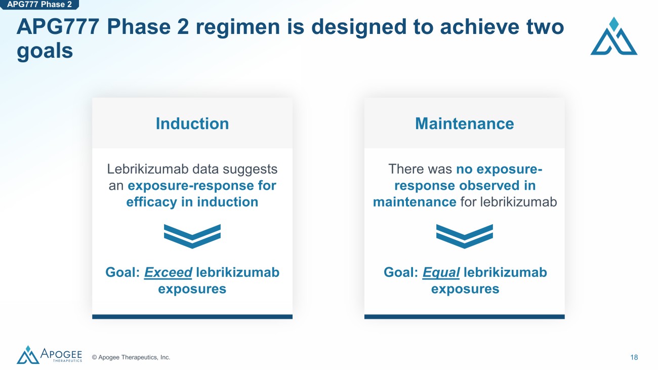 18 © Apogee Therapeutics, Inc. APG777 Phase 2 regimen is designed to achieve two goals Induction Goal: Exceed lebrikizumab exposures Maintenance Goal: Equal lebrikizumab exposures Lebrikizumab data suggests an exposure - response for efficacy in induction There was no exposure - response observed in maintenance for lebrikizumab APG777 Phase 2