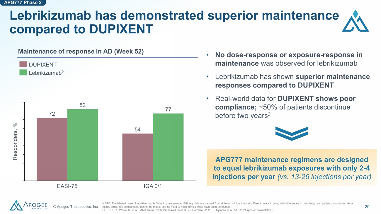 19 © Apogee Therapeutics, Inc. Lebrikizumab Ph3 subgroup with higher exposures had consistently better efficacy across key endpoints Efficacy of biologics in AD (Week 16, placebo - adjusted) 34 26 28 38 25 26 49 38 38 Responders, % EASI - 75 EASI - 90 IGA 0/1 DUPIXENT Ph3 Lebrikizumab Ph3, all patients (N = 851) Lebrikizumab Ph3, <60 kg subgroup (N = 180) NOTE: In lebrikizumab Ph2b and Ph3 there has been no dose - AE or exposure - AE relationship. Lebrikizumab exposures and efficacy ar e for the Phase 3 dose (500 mg Loading Dose at Weeks 0 and 2, 250 mg Q2W Weeks 4 to 16). Efficacy data are derived from different clinical trials at different points in time, with differences in trial design and pa tie nt populations. As a result, cross - trial comparisons cannot be made, and no head - to - head clinical trials have been conducted. SOURCE: Lebrikizumab European Public Assessment Report. DUPIXENT USPI. • Exposure - response in induction demonstrated by lebrikizumab • ~30% higher exposures in lebrikizumab low bodyweight subgroup led to improved efficacy across endpoints APG777 Ph2 Part A targets ~30 - 40% higher exposure than lebrikizumab in induction with ~50% fewer injections ~30% higher exposure in subgroup APG777 Phase 2
