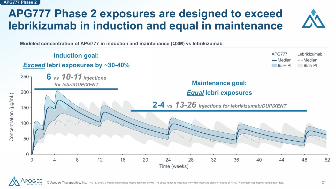 20 © Apogee Therapeutics, Inc. Lebrikizumab has demonstrated superior maintenance compared to DUPIXENT 72 54 82 77 Maintenance of response in AD (Week 52 ) Responders, % EASI - 75 IGA 0/1 • N o dose - response or exposure - response in maintenance was observed for lebrikizumab • Lebrikizumab has shown superior maintenance responses compared to DUPIXENT • Real - world data for DUPIXENT shows poor compliance; ~50% of patients discontinue before two years 3 APG777 maintenance regimens are designed to equal lebrikizumab exposures with only 2 - 4 injections per year (vs. 13 - 26 injections per year) DUPIXENT 1 Lebrikizumab 2 NOTE: The labeled dose of lebrikizumab is Q4W in maintenance. Efficacy data are derived from different clinical trials at different points in time, with differences in trial design and pa tie nt populations. As a result, cross - trial comparisons cannot be made, and no head - to - head clinical trials have been conducted. SOURCE: 1) Worm, M, et al, JAMA Derm, 2020. 2) Blauvelt, A et al Br J Dermatol, 2023. 3) Symons et al. AAD 2024 (poster prese nta tion) APG777 Phase 2