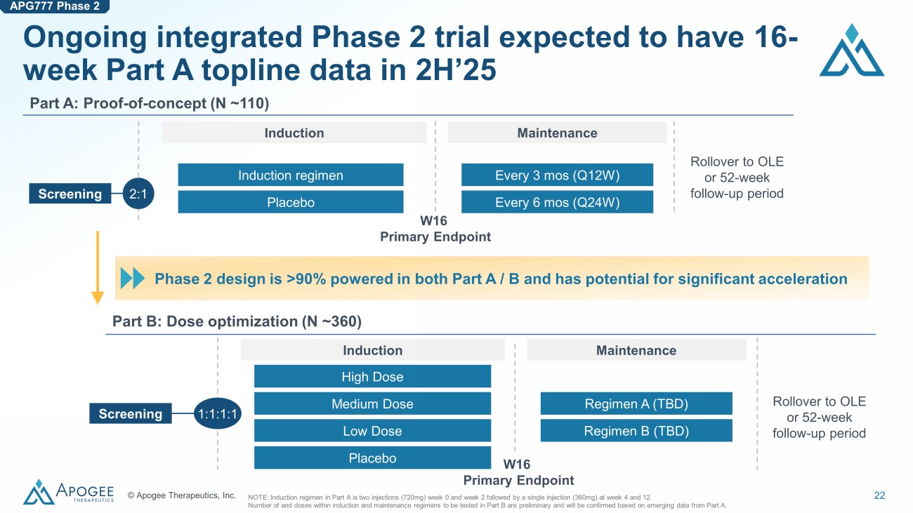 21 © Apogee Therapeutics, Inc. APG777 Phase 2 exposures are designed to exceed lebrikizumab in induction and equal in maintenance 2 - 4 vs 13 - 26 injections for lebrikizumab/DUPIXENT Modeled concentration of APG777 in induction and maintenance (Q3M) vs lebrikizumab APG777 Median 95% PI Lebrikizumab Median 95% PI NOTE: Every 3 - month maintenance dosing regimen shown. The above graph is illustrative only with respect to plans for dosing of A PG777 and does not present comparative data. 6 vs 10 - 11 injections for lebri/DUPIXENT Induction goal: Exceed lebri exposures by ~30 - 40% Maintenance goal: Equal lebri exposures 250 200 150 100 50 0 0 4 8 12 16 20 24 28 32 36 40 44 48 52 Time (weeks) Concentration ( μ g/mL) APG777 Phase 2