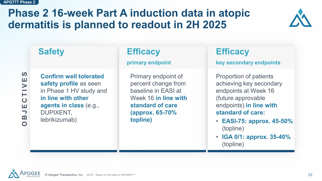 22 © Apogee Therapeutics, Inc. Phase 2 design is >90% powered in both Part A / B and has potential for significant acceleration Ongoing integrated Phase 2 trial expected to have 16 - week Part A topline data in 2H’25 Part A: Proof - of - concept (N ~110) Induction Maintenance Screening 2:1 Every 3 mos (Q12W) Every 6 mos (Q24W) W16 Primary Endpoint NOTE: Induction regimen in Part A is two injections (720mg) week 0 and week 2 followed by a single injection (360mg) at week 4 a nd 12. Number of and doses within induction and maintenance regimens to be tested in Part B are preliminary and will be confirmed ba sed on emerging data from Part A. Rollover to OLE or 52 - week follow - up period Part B: Dose optimization (N ~360) Screening 1:1:1:1 Regimen A (TBD) Rollover to OLE or 52 - week follow - up period High Dose Medium Dose Low Dose Placebo Maintenance Induction W16 Primary Endpoint Regimen B (TBD) APG777 Phase 2 Induction regimen Placebo