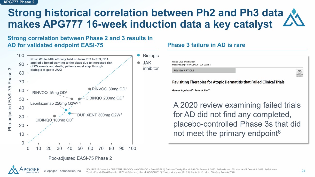24 © Apogee Therapeutics, Inc. Strong historical correlation between Ph2 and Ph3 data makes APG777 16 - week induction data a key catalyst SOURCE: Ph3 data for DUPIXENT, RINVOQ, and CIBINQO is from USPI. 1) Guttman - Yassky E et al J All Clin Immunol. 2020. 2) Gooderham MJ et al JAMA Dermatol . 2019. 3) Guttman - Yassky E et al JAMA Dermatol. 2020. 4) Silverberg JI et al. NEJM 2023 5) Thaci et al. Lancet 2016 . 6) Agnihotri, G., et al. Clin Drug Investig 2020 0 10 20 30 40 50 60 70 80 90 100 0 10 20 30 40 50 60 70 80 90 100 RINVOQ 15mg QD 1 DUPIXENT 300mg Q2W 5 RINVOQ 30mg QD 1 CIBINQO 100mg QD 2 CIBINQO 200mg QD 2 Lebrikizumab 250mg Q2W 3,4 Pbo - adjusted EASI - 75 Phase 3 Pbo - adjusted EASI - 75 Phase 2 Biologic Note: While JAKi efficacy held up from Ph2 to Ph3, FDA applied a boxed warning to the class due to increased risk of CV events and death; patients must step through biologic to get to JAKi JAK inhibitor Strong correlation between Phase 2 and 3 results in AD for validated endpoint EASI - 75 Phase 3 failure in AD is rare A 2020 review examining failed trials for AD did not find any completed, placebo - controlled Phase 3s that did not meet the primary endpoint 6 APG777 Phase 2