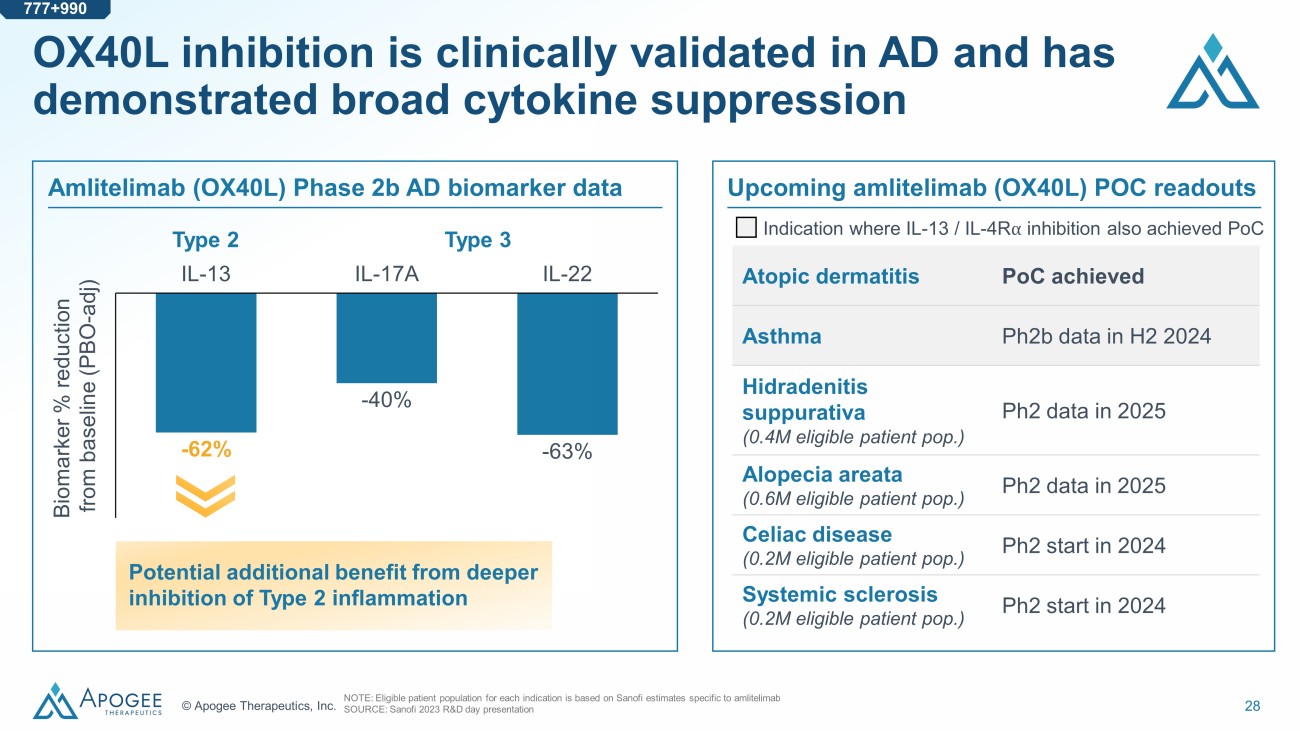 27 © Apogee Therapeutics, Inc. OX40L / OX40 interaction drives Type 1, 2, and 3 inflammation in atopic dermatitis NOTE: Amlitelimab biomarker changes presented are average values across dose cohorts based on approximate data points from di git ized charts. APC = antigen presenting cell SOURCE: Sanofi 2023 R&D day presentation • OX40L is expressed on antigen - presenting cells (APCs) • OX40L / OX40 interaction promotes inflammatory T cell responses in AD • T cells produce Type 1, 2, and 3 cytokines that drive inflammation and AD symptoms • Type 2 (IL - 13) is the core pathway in AD; Type 1 and 3 play a secondary role in specific subpopulations Blocking OX40L / OX40 interaction has the potential to broadly inhibit Type 1, 2, and 3 inflammation 777+990 OX40L OX40 APC T cell Type 1 Type 2 Type 3 IFNγ IL - 13 IL - 22 TNF ⍺ IL - 17 Cytokine response