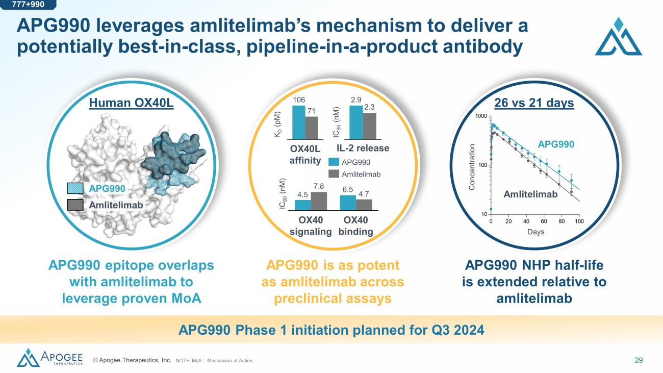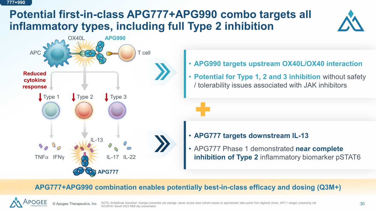 29 © Apogee Therapeutics, Inc. APG990 leverages amlitelimab’s mechanism to deliver a potentially best - in - class, pipeline - in - a - product antibody 4.5 6.5 7.8 4.7 OX40 signaling OX40 binding IC 90 (nM) APG990 epitope overlaps with amlitelimab to leverage proven MoA APG990 is as potent as amlitelimab across preclinical assays APG990 NHP half - life is extended relative to amlitelimab NOTE: MoA = Mechanism of Action. 106 71 OX40L affinity APG990 Amlitelimab IC 90 (nM) K D (pM) 2.9 2.3 IL - 2 APG990 Concentration Days 26 vs 21 days Amlitelimab IL - 2 release APG990 Amlitelimab Human OX40L APG990 Phase 1 initiation planned for Q3 2024 777+990