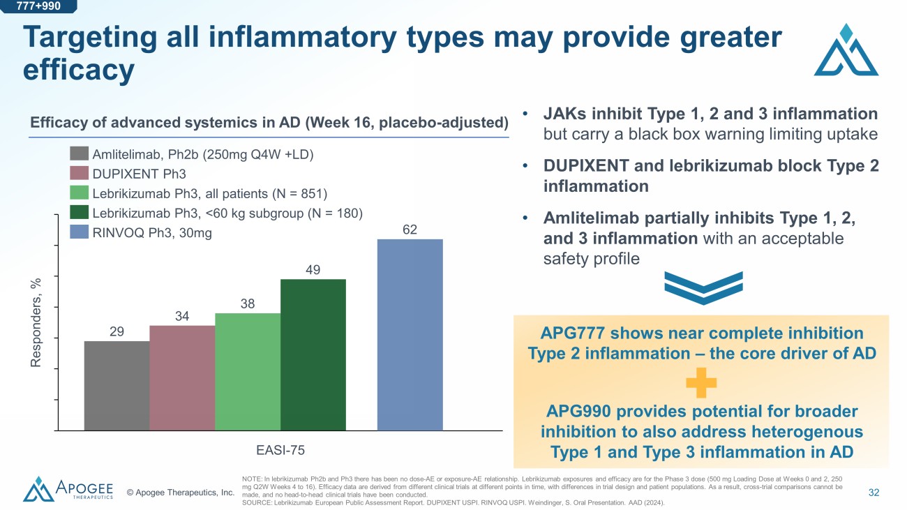 31 © Apogee Therapeutics, Inc. IL - 13 and OX40L are the two orthogonal mechanisms with greatest efficacy in AD Target IL - 13 1,2 IL - 4R α 3 OX40L 4 IL - 22R 5 IL - 31R 6 TSLP 7 IL - 22 8 Agent Lebrikizumab (high - exposure) Lebrikizumab Amlitelimab LEO138559 Nemolizumab Fezakinumab Inflammation targeted Type 2 Type 2 Type 1, 2, 3 Type 3 Type 2 Type 2, 3 Type 3 EASI - 75 % responders pbo adjusted IGA(0,1) % responders pbo adjusted 49 38 34 38 26 28 Not available Approved In development Terminated Status in AD Selected targets for 777+990 combination We are combining two of the most active and orthogonal MOAs with potential to exceed monotherapy efficacy 29 28 13 15 17 20 11 17 10 777+990 NOTE: MOA = Mechanism of Action. Tezspire and nemolizumab results are from combination trials with TCS. Fezakinumab data is from week 20 while all others are week 16. Lebrikizumab, DUPIXENT, and nemolizumab values reflect the weighted average from phase 3 trials, all other values are from Ph2 trials. Nemolizumab is approved in Japan for itch associated with AD and marketed as Mitchga . Lebrikizumab is approved in the EU under the marketed name Ebglyss. SOURCE: 1. Silverberg J et al. NEJM. (2023). 2. Ebglyss EMA Public Assess men t Report. 3. Simpson E at al. NEJM. (2016) 4. Weidinger S et al. EADV oral presentation (2023). 5.Thaci et al. AAD oral presentation (2023). 6. Silverberg J. EADV oral presentation (2023) 7. Simpson E et al. J Am Acad Dermatol. (2019). 8. Guttman - Yassky E et al. J Am Acad Dermatol.(2018)