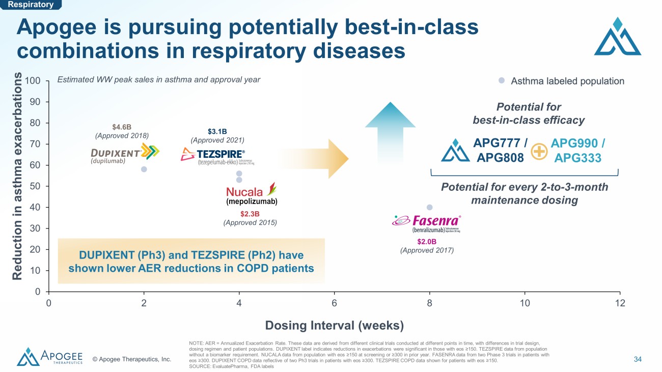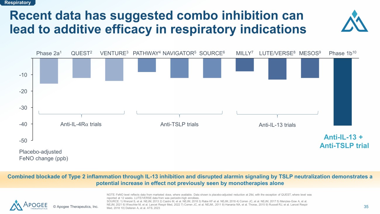 34 © Apogee Therapeutics, Inc. 0 10 20 30 40 50 60 70 80 90 100 0 2 4 6 8 10 12 Dosing Interval (weeks) Tezepelumab asthma ITT Mepolizumab asthma ≥150 Benralizumab asthma ≥300 Apogee is pursuing potentially best - in - class combinations in respiratory diseases Reduction in asthma exacerbations Potential for best - in - class efficacy APG990 / APG333 APG777 / APG808 Respiratory Potential for every 2 - to - 3 - month maintenance dosing NOTE: AER = Annualized Exacerbation Rate. These data are derived from different clinical trials conducted at different points in time, with differences in trial design , dosing regimen and patient populations. DUPIXENT label indicates reductions in exacerbations were significant in those with eos ≥150. TEZSPIRE data from population without a biomarker requirement. NUCALA data from population with eos ≥150 at screening or ≥300 in prior year. FASENRA data from two Phase 3 trials in patients with eos ≥300. DUPIXENT COPD data reflective of two Ph3 trials in patients with eos ≥300. TEZSPIRE COPD data shown for patients with eos ≥150. SOURCE: EvaluatePharma , FDA labels DUPIXENT (Ph3) and TEZSPIRE (Ph2) have shown lower AER reductions in COPD patients $4.6B (Approved 2018) Estimated WW peak sales in asthma and approval year $3.1B (Approved 2021) $2.3B (Approved 2015) $2.0B (Approved 2017)
