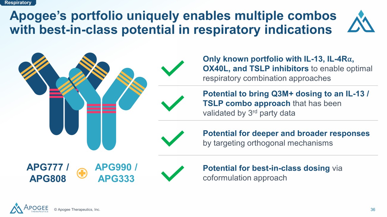 35 © Apogee Therapeutics, Inc. - 40 - 30 - 20 - 10 - 50 Phase 2a 1 QUEST 2 Placebo - adjusted FeNO change (ppb) PATHWAY 4 NAVIGATOR 5 SOURCE 6 MILLY 7 LUTE/VERSE 8 MESOS 9 Phase 1b 10 VENTURE 3 Respiratory Recent data has suggested combo inhibition can lead to additive efficacy in respiratory indications Anti - IL - 4R ⍺ trials Anti - TSLP trials Anti - IL - 13 trials Combined blockade of Type 2 inflammation through IL - 13 inhibition and disrupted alarmin signaling by TSLP neutralization demonst rates a potential increase in effect not previously seen by monotherapies alone Anti - IL - 13 + Anti - TSLP trial NOTE: FeNO level reflects data from marketed dose, where available. Data shown is placebo - adjusted reduction at 29d, with the exception of QUEST, where level was reported at 12 weeks. LUTE/VERSE data from was periostin - high enrollees. SOURCE: 1) Wenzel S, et al. NEJM, 2013 2) Castro M, et al. NEJM, 2018 3) Rabe KF et al. NEJM, 2018 4) Corren JC, et al. NEJM, 2017 5) Menzies - Gow A, et al. NEJM, 2021 6) Weschler M, et al. Lancet Respir Med, 2022 7) Corren JC, et al. NEJM., 2011 8) Hanania NA, et al. Thorax, 2015 9) Russell RJ, et al. Lancet Respir Med, 2018 10) Deiteren A, et al. ATS, 2023