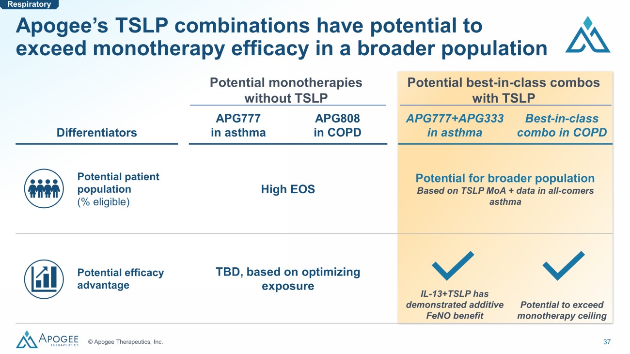 36 © Apogee Therapeutics, Inc. Apogee’s portfolio uniquely enables multiple combos with best - in - class potential in respiratory indications Only known portfolio with IL - 13, IL - 4R ⍺ , OX40L, and TSLP inhibitors to enable optimal respiratory combination approaches Potential to bring Q3M+ dosing to an IL - 13 / TSLP combo approach that has been validated by 3 rd party data Potential for deeper and broader responses by targeting orthogonal mechanisms Potential for best - in - class dosing via coformulation approach Respiratory APG777 / APG808 APG990 / APG333