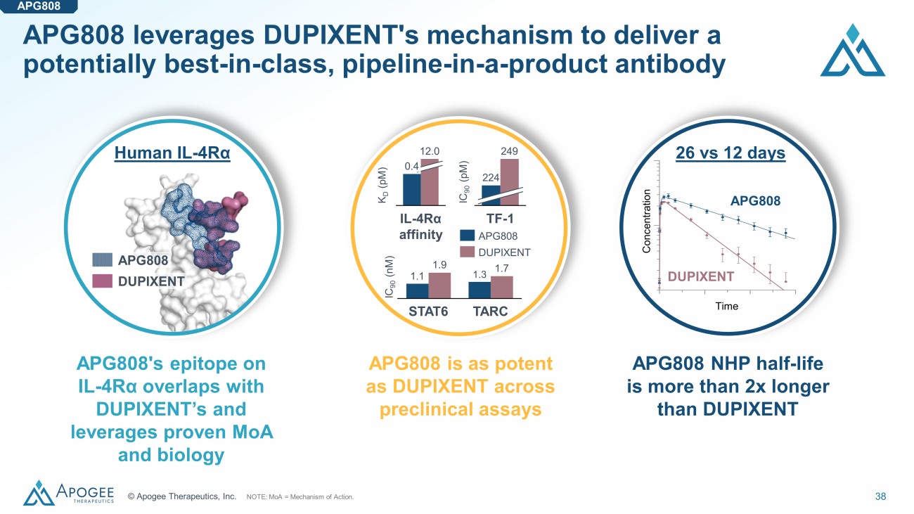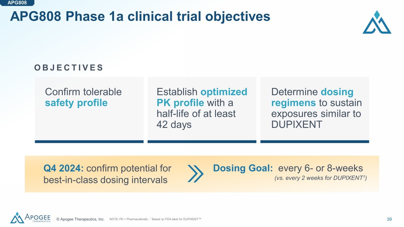38 © Apogee Therapeutics, Inc. APG808 leverages DUPIXENT's mechanism to deliver a potentially best - in - class, pipeline - in - a - product antibody 1.1 1.3 1.9 1.7 STAT6 TARC IC 90 (nM) APG808 Concentration Time 26 vs 12 days Human IL - 4R α APG808's epitope on IL - 4R α overlaps with DUPIXENT’s and leverages proven MoA and biology APG808 is as potent as DUPIXENT across preclinical assays APG808 NHP half - life is more than 2x longer than DUPIXENT NOTE: MoA = Mechanism of Action. 12.0 0.4 IL - 4Rα affinity APG808 DUPIXENT APG808 DUPIXENT IC 90 (pM) K D (pM) 249 224 TF - 1 DUPIXENT APG808
