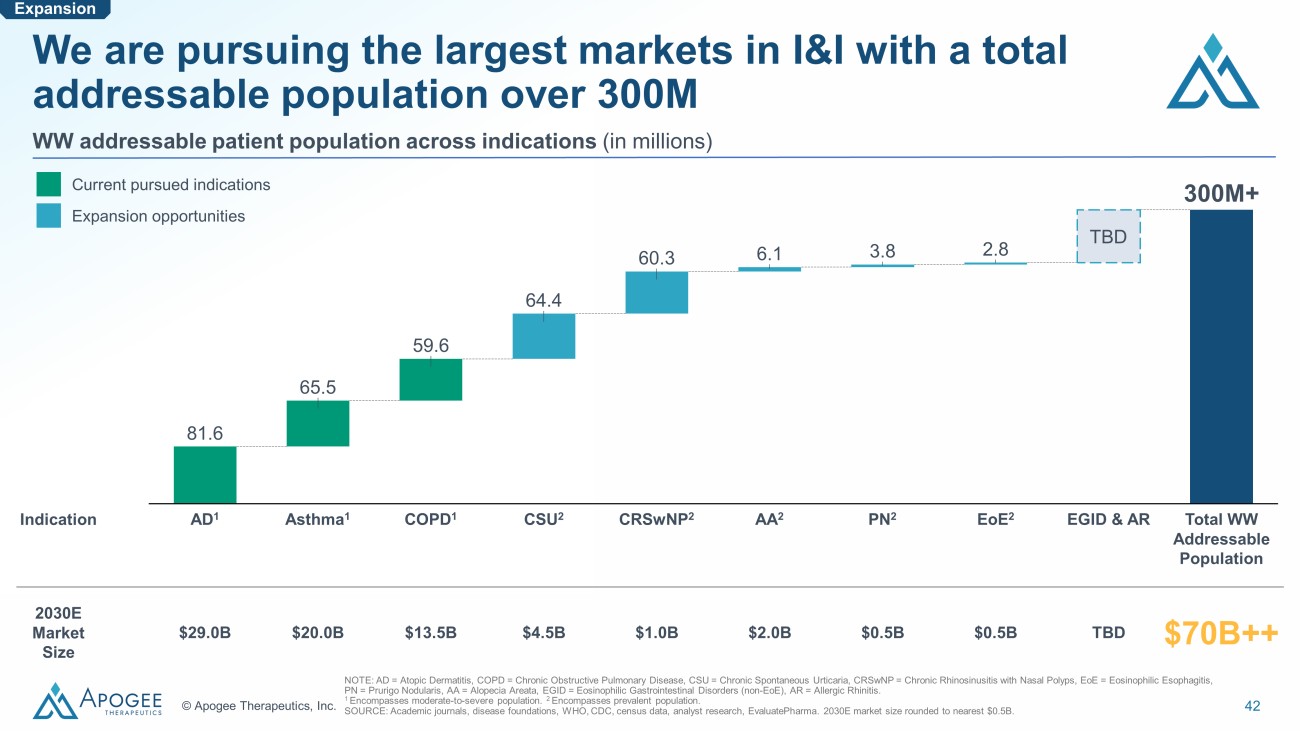 41 © Apogee Therapeutics, Inc. Dermatology AD AA PN BP HS Pulmonology / Immunology Asthma 1 COPD 1 CRSwNP CSU AR 2 ColdU CPUO Food allergy SS Gastroenterology EoE Celiac Disease EGID UC 1 Planned Apogee Ph2 based on well - established mechanism 3 rd party clinical data supporting one or more Apogee targets Ongoing 3 rd party clinical trials which could validate one or more Apogee targets Expansion Our programs have broad potential to disrupt the I&I space NOTE: 1 Eosinophilic subtypes 2 Perennial AA = Alopecia Areata. PN = Prurigo Nodularis . BP= Bullous Pemphigoid. HS = hidradenitis suppurativa. CSU = Chronic Spontaneous Urticaria. CRSwNP = Chronic Rhinosinusitis with Nasal Polyps ColdU = Cold Inducible Urticaria. CPUO = Chronic Pruritis of Unknown Origin. . AR = Allergic Rhinitis. SS= Systemic Sclerosis. EoE = Eosinophilic esophagitis. UC = Ulcerative Colitis. EGID = Eosinophilic Gastrointestinal Disorders (non - EoE ) . Potential blockbuster expansion