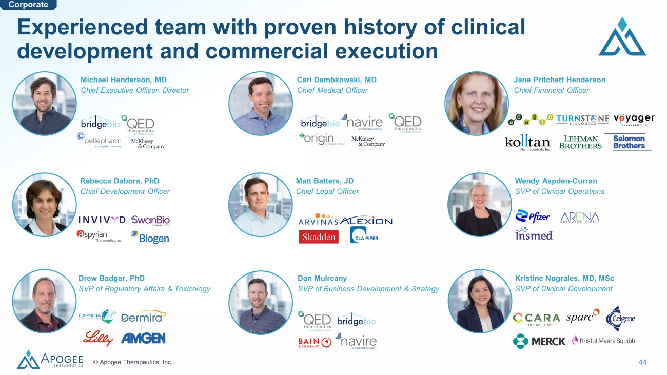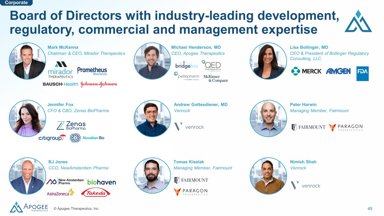 44 © Apogee Therapeutics, Inc. Michael Henderson, MD Chief Executive Officer, Director Carl Dambkowski, MD Chief Medical Officer Jane Pritchett Henderson Chief Financial Officer Rebecca Dabora, PhD Chief Development Officer Matt Batters, JD Chief Legal Officer Wendy Aspden - Curran SVP of Clinical Operations Drew Badger, PhD SVP of Regulatory Affairs & Toxicology Dan Mulreany SVP of Business Development & Strategy Kristine Nograles, MD, MSc SVP of Clinical Development Corporate Experienced team with proven history of clinical development and commercial execution