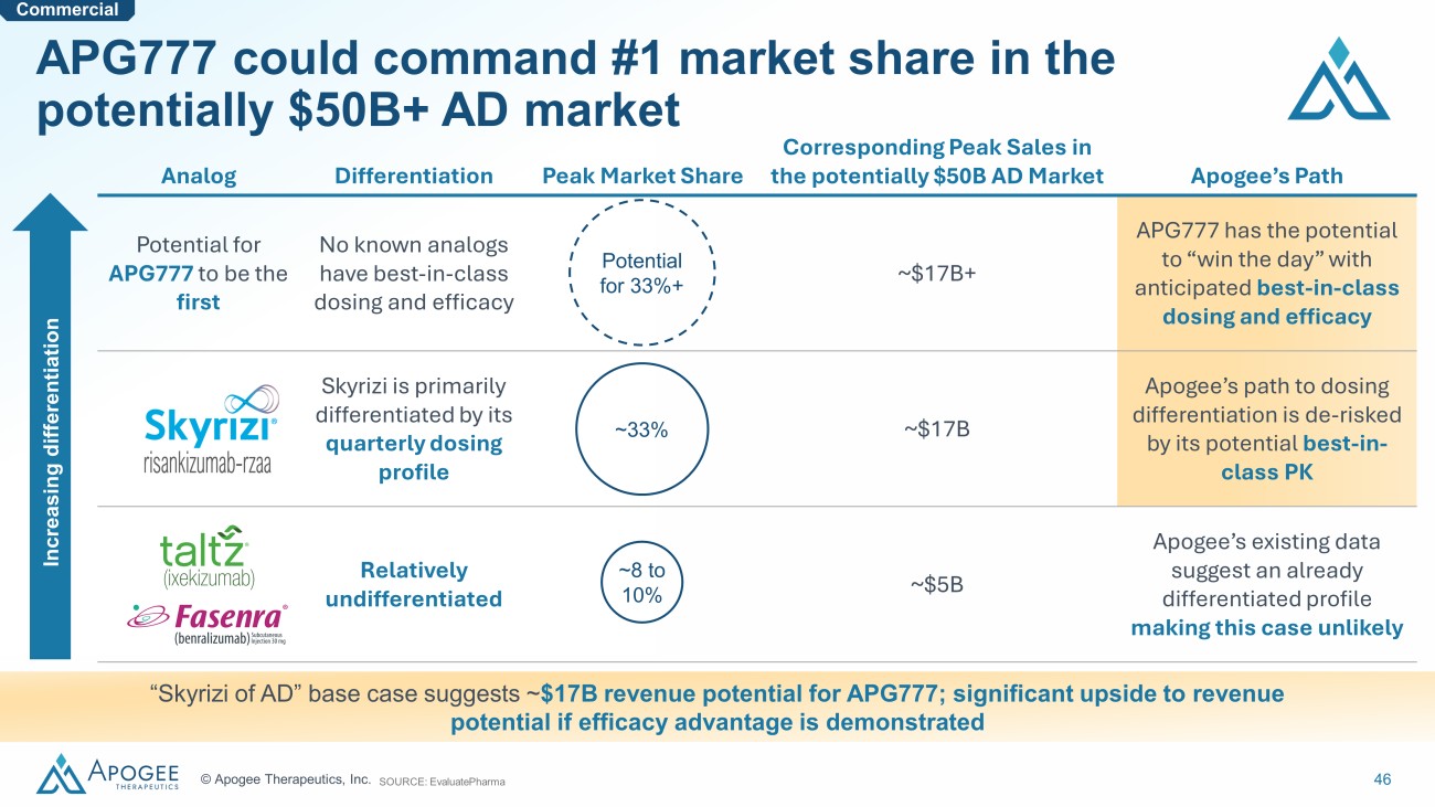 46 © Apogee Therapeutics, Inc. Analog Differentiation Peak Market Share Corresponding Peak Sales in the potentially $50B AD Market Apogee’s Path Potential for APG777 to be the first No known analogs have best - in - class dosing and efficacy ~$17B+ APG777 has the potential to “win the day” with anticipated best - in - class dosing and efficacy Skyrizi is primarily differentiated by its quarterly dosing profile ~$17B Apogee’s path to dosing differentiation is de - risked by its potential best - in - class PK Relatively undifferentiated ~$5B Apogee’s existing data suggest an already differentiated profile making this case unlikely APG777 could command #1 market share in the potentially $50B+ AD market SOURCE: EvaluatePharma “Skyrizi of AD” base case suggests ~ $ 17 B revenue potential for APG777; significant upside to revenue potential if efficacy advantage is demonstrated Increasing differentiation Commercial ~8 to 10% ~33% Potential for 33%+