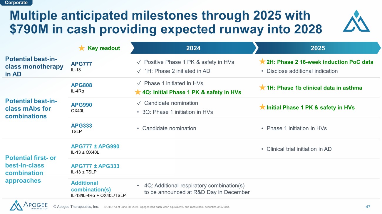 47 © Apogee Therapeutics, Inc. Corporate Multiple anticipated milestones through 2025 with $790M in cash providing expected runway into 2028 Potential best - in - class monotherapy in AD APG777 IL - 13 ✓ Positive Phase 1 PK & safety in HVs ✓ 1H: Phase 2 initiated in AD • 2H: Phase 2 16 - week induction PoC data • Disclose additional indication Potential best - in - class mAbs for combinations APG808 IL - 4R α ✓ Phase 1 initiated in HVs • 4Q: Initial Phase 1 PK & safety in HVs • 1H: Phase 1b clinical data in asthma APG990 OX40L ✓ Candidate nomination • 3Q: Phase 1 initiation in HVs • Initial Phase 1 PK & safety in HVs APG333 TSLP • Candidate nomination • Phase 1 initiation in HVs Potential first - or best - in - class combination approaches APG777 ± APG990 IL - 13 ± OX40L • Clinical trial initiation in AD APG777 ± APG333 IL - 13 ± TSLP Additional combination(s) IL - 13/IL - 4R α + OX40L/TSLP • 4Q: Additional respiratory combination(s) to be announced at R&D Day in December 2025 2024 NOTE: As of June 30, 2024, Apogee had cash, cash equivalents and marketable securities of $790M. Key readout