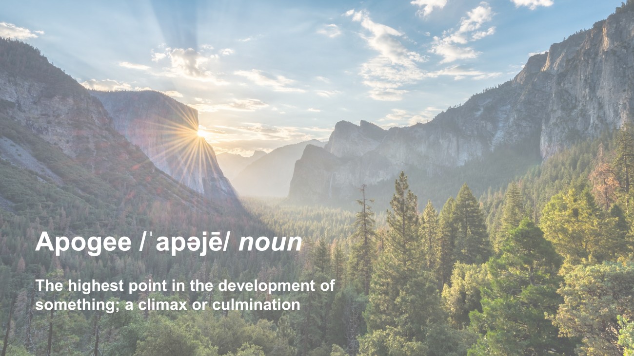 Apogee /ˈ apəjē / noun The highest point in the development of something; a climax or culmination