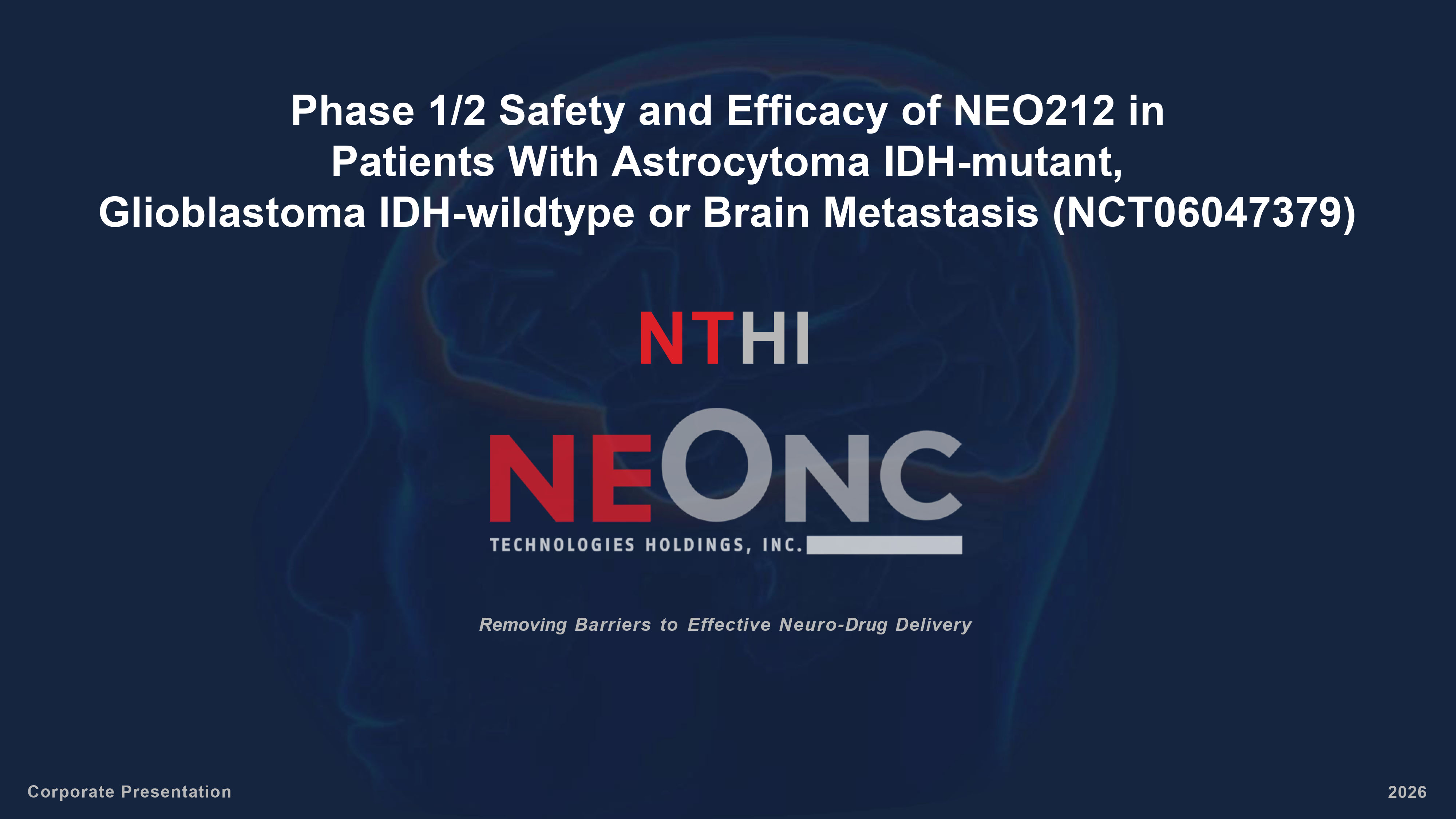 Removing Barriers to Effective Neuro - Drug Delivery Corporate Presentation 202 6 NT HI Phase 1/2 Safety and Efficacy of NEO212 in Patients With Astrocytoma IDH - mutant, Glioblastoma IDH - wildtype or Brain Metastasis (NCT06047379)