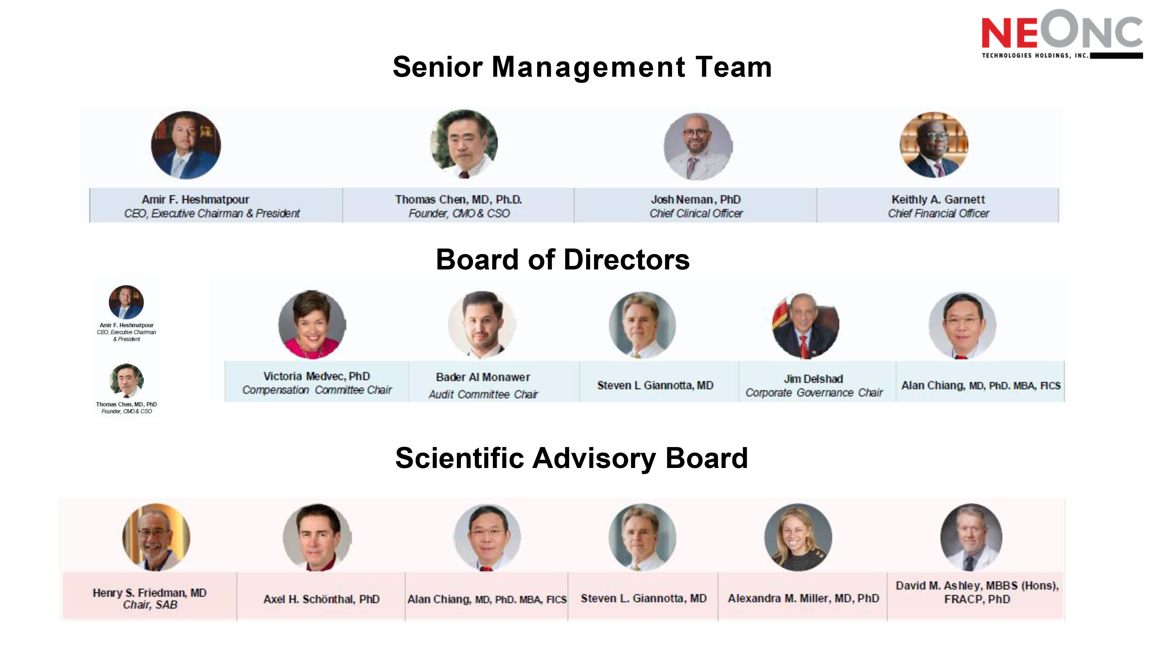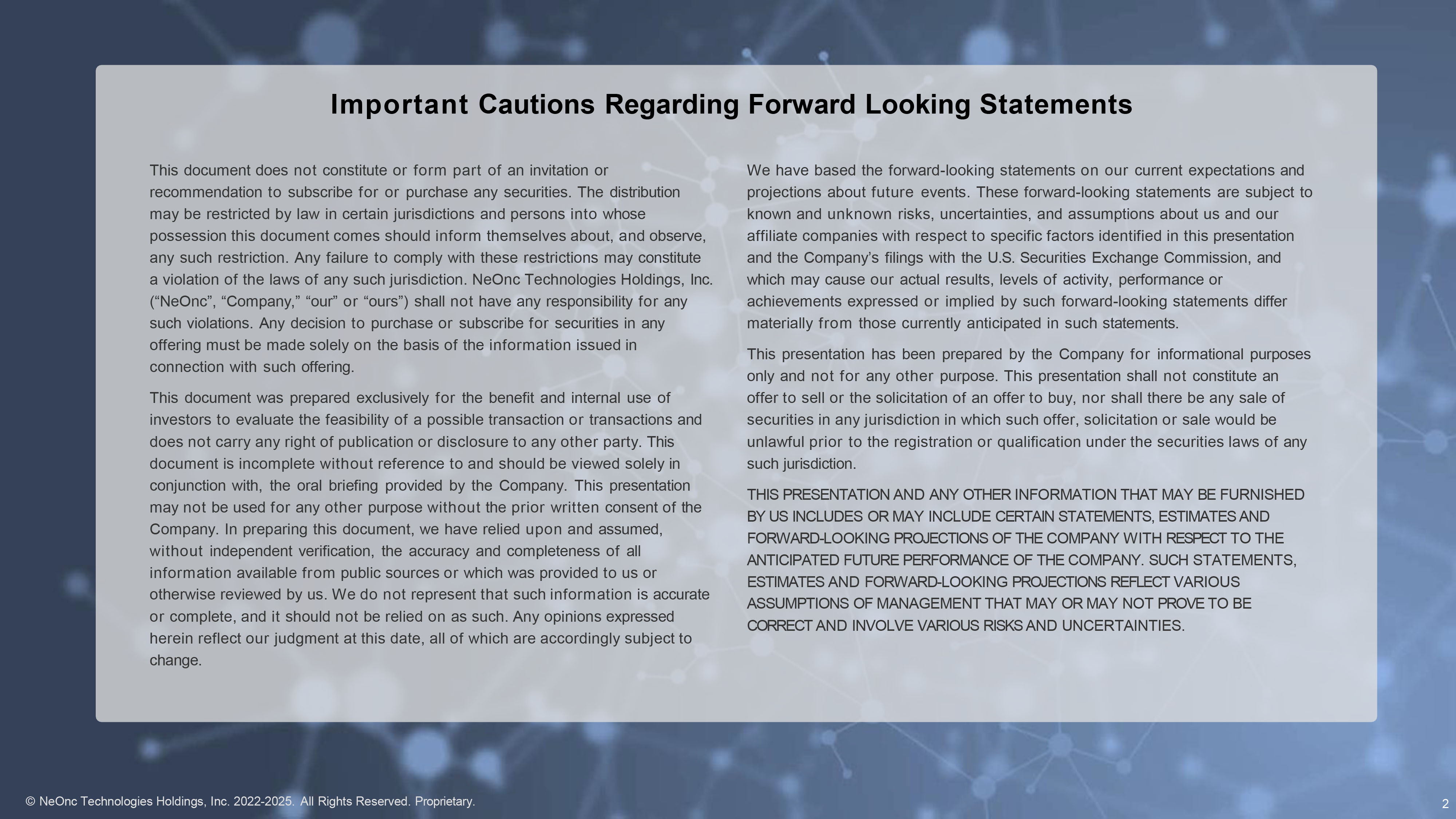 Important Cautions Regarding Forward Looking Statements © NeOnc Technologies Holdings, Inc. 2022 - 2025. All Rights Reserved. Proprietary. 2 This document does not constitute or form part of an invitation or recommendation to subscribe for or purchase any securities. The distribution may be restricted by law in certain jurisdictions and persons into whose possession this document comes should inform themselves about, and observe, any such restriction. Any failure to comply with these restrictions may constitute a violation of the laws of any such jurisdiction. NeOnc Technologies Holdings, Inc. (“NeOnc”, “Company,” “our” or “ours”) shall not have any responsibility for any such violations. Any decision to purchase or subscribe for securities in any offering must be made solely on the basis of the information issued in connection with such offering. This document was prepared exclusively for the benefit and internal use of investors to evaluate the feasibility of a possible transaction or transactions and does not carry any right of publication or disclosure to any other party. This document is incomplete without reference to and should be viewed solely in conjunction with, the oral briefing provided by the Company. This presentation may not be used for any other purpose without the prior written consent of the Company. In preparing this document, we have relied upon and assumed, without independent verification, the accuracy and completeness of all information available from public sources or which was provided to us or otherwise reviewed by us. We do not represent that such information is accurate or complete, and it should not be relied on as such. Any opinions expressed herein reflect our judgment at this date, all of which are accordingly subject to change. We have based the forward - looking statements on our current expectations and projections about future events. These forward - looking statements are subject to known and unknown risks, uncertainties, and assumptions about us and our affiliate companies with respect to specific factors identified in this presentation and the Company’s filings with the U.S. Securities Exchange Commission, and which may cause our actual results, levels of activity, performance or achievements expressed or implied by such forward - looking statements differ materially from those currently anticipated in such statements. This presentation has been prepared by the Company for informational purposes only and not for any other purpose. This presentation shall not constitute an offer to sell or the solicitation of an offer to buy, nor shall there be any sale of securities in any jurisdiction in which such offer, solicitation or sale would be unlawful prior to the registration or qualification under the securities laws of any such jurisdiction. THIS PRESENTATION AND ANY OTHER INFORMATION THAT MAY BE FURNISHED BY US INCLUDES OR MAY INCLUDE CERTAIN STATEMENTS, ESTIMATES AND FORWARD - LOOKING PROJECTIONS OF THE COMPANY WITH RESPECT TO THE ANTICIPATED FUTURE PERFORMANCE OF THE COMPANY. SUCH STATEMENTS, ESTIMATES AND FORWARD - LOOKING PROJECTIONS REFLECT VARIOUS ASSUMPTIONS OF MANAGEMENT THAT MAY OR MAY NOT PROVE TO BE CORRECT AND INVOLVE VARIOUS RISKS AND UNCERTAINTIES.