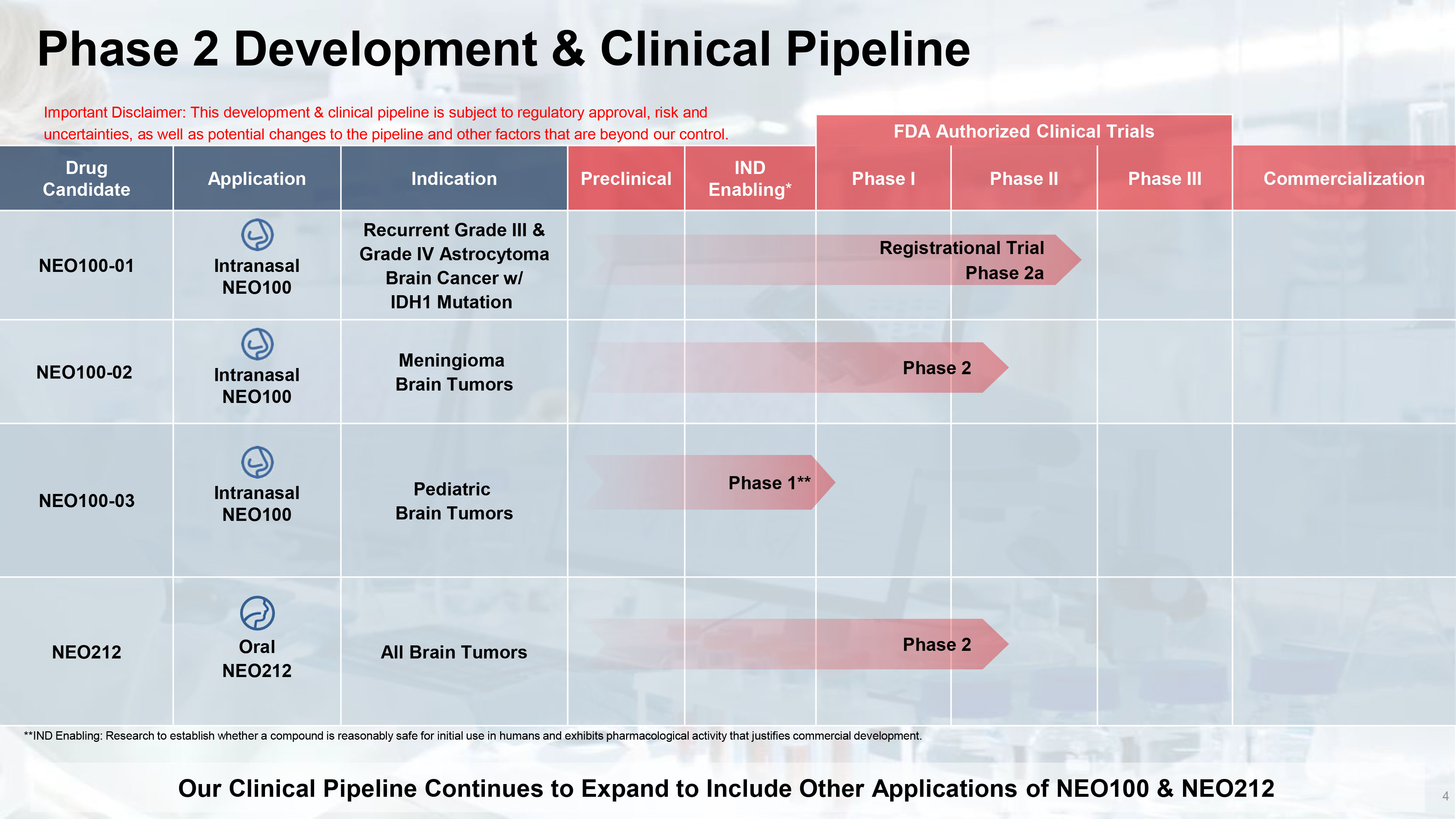Phase 2 Development & Clinical Pipeline 4 FDA Authorized Clinical Trials Commercialization Phase III Phase II Phase I IND Enabling * Preclinical Indication Application Drug Candidate Recurrent Grade III & Grade IV Astrocytoma Brain Cancer w/ IDH1 Mutation Intranasal NEO100 NEO100 - 01 Meningioma Brain Tumors Intranasal NEO100 NEO100 - 02 Pediatric Brain Tumors Intranasal NEO100 NEO100 - 03 All Brain Tumors Oral NEO212 NEO212 Phase 2 Phase 1** Our Clinical Pipeline Continues to Expand to Include Other Applications of NEO100 & NEO212 Important Disclaimer: This development & clinical pipeline is subject to regulatory approval, risk and uncertainties, as well as potential changes to the pipeline and other factors that are beyond our control. Phase 2 Registrational Trial Phase 2a **IND Enabling: Research to establish whether a compound is reasonably safe for initial use in humans and exhibits pharmacolo gic al activity that justifies commercial development.