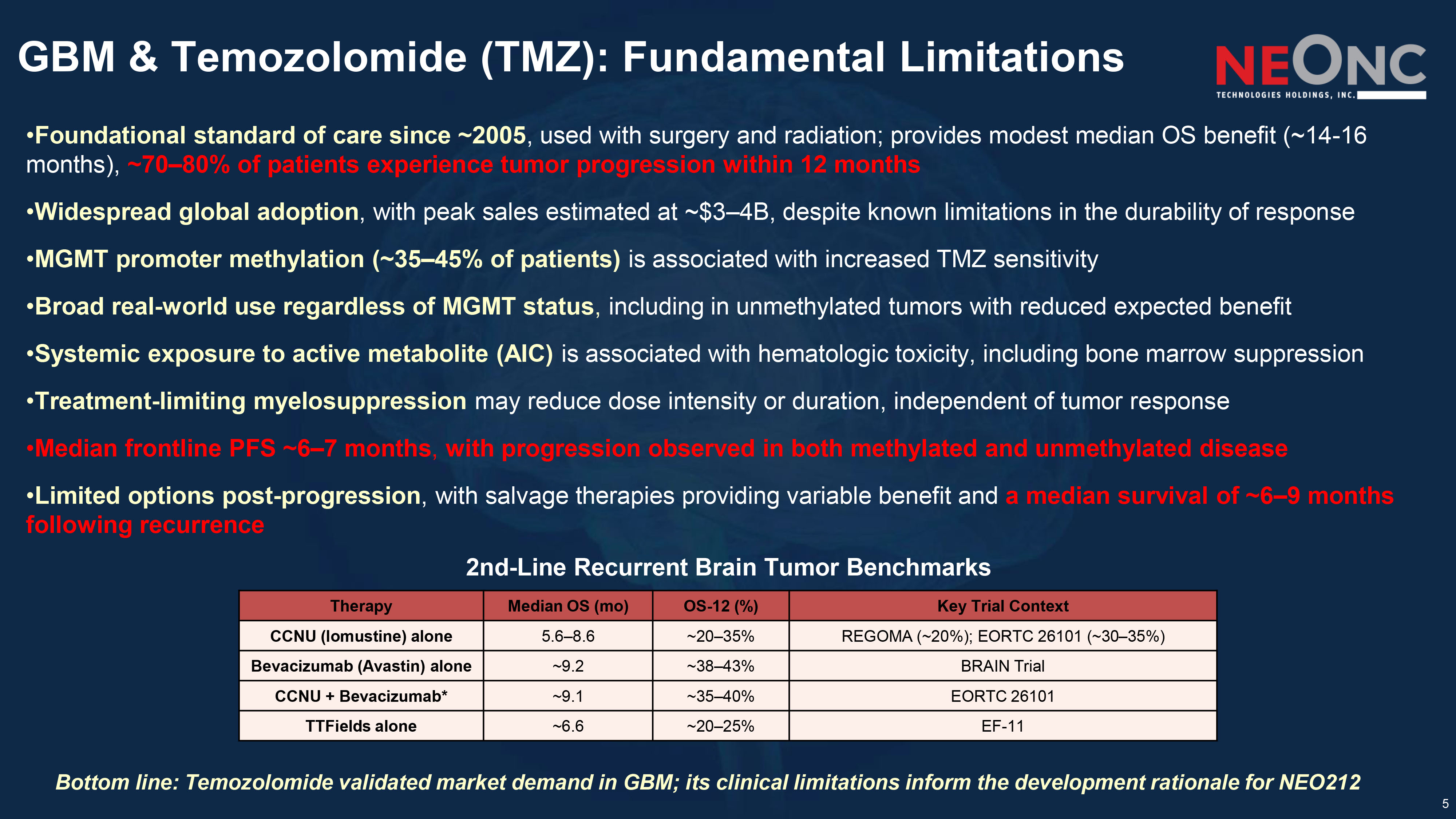 5 GBM & Temozolomide (TMZ): Fundamental Limitations Bottom line: Temozolomide validated market demand in GBM; its clinical limitations inform the development rationale for NEO212 2nd - Line Recurrent Brain Tumor Benchmarks • Foundational standard of care since ~2005 , used with surgery and radiation; provides modest median OS benefit (~14 - 16 months), ~70 – 80% of patients experience tumor progression within 12 months • Widespread global adoption , with peak sales estimated at ~$3 – 4B, despite known limitations in the durability of response • MGMT promoter methylation (~35 – 45% of patients) is associated with increased TMZ sensitivity • Broad real - world use regardless of MGMT status , including in unmethylated tumors with reduced expected benefit • Systemic exposure to active metabolite (AIC) is associated with hematologic toxicity, including bone marrow suppression • Treatment - limiting myelosuppression may reduce dose intensity or duration, independent of tumor response • Median frontline PFS ~6 – 7 months , with progression observed in both methylated and unmethylated disease • Limited options post - progression , with salvage therapies providing variable benefit and a median survival of ~6 – 9 months following recurrence Key Trial Context OS - 12 (%) Median OS ( mo ) Therapy REGOMA (~20%); EORTC 26101 (~30 – 35%) ~20 – 35% 5.6 – 8.6 CCNU ( lomustine ) alone BRAIN Trial ~38 – 43% ~9.2 Bevacizumab (Avastin) alone EORTC 26101 ~35 – 40% ~9.1 CCNU + Bevacizumab* EF - 11 ~20 – 25% ~6.6 TTFields alone