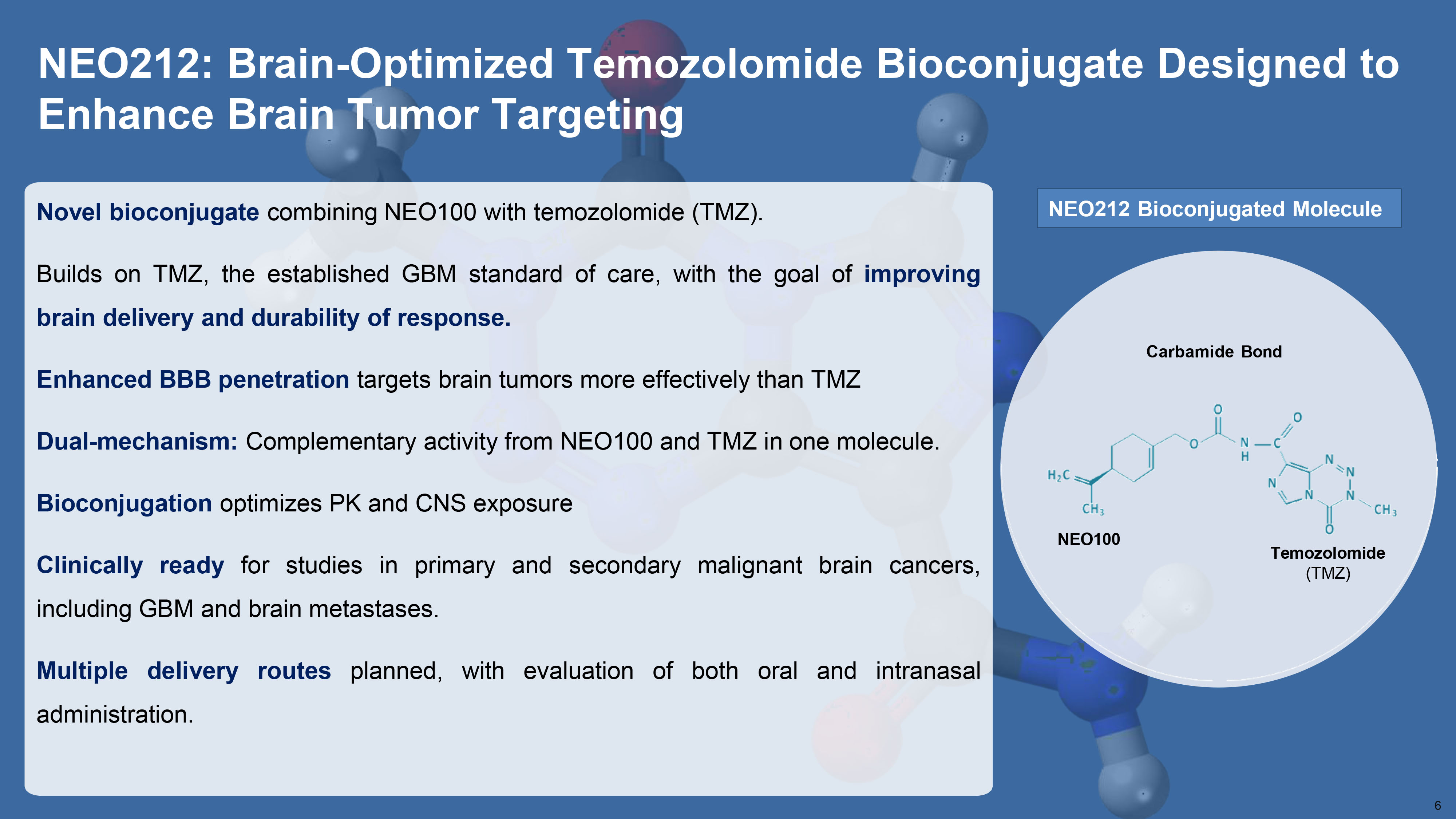 NEO212: Brain - Optimized Temozolomide Bioconjugate Designed to Enhance Brain Tumor Targeting NEO100 Temozolomide (TMZ) Carbamide Bond NEO212 Bioconjugated Molecule 6 Novel bioconjugate combining NEO 100 with temozolomide (TMZ) . Builds on TMZ, the established GBM standard of care, with the goal of improving brain delivery and durability of response . Enhanced BBB penetration targets brain tumors more effectively than TMZ Dual - mechanism : Complementary activity from NEO 100 and TMZ in one molecule . Bioconjugation optimizes PK and CNS exposure Clinically ready for studies in primary and secondary malignant brain cancers, including GBM and brain metastases . Multiple delivery routes planned, with evaluation of both oral and intranasal administration .