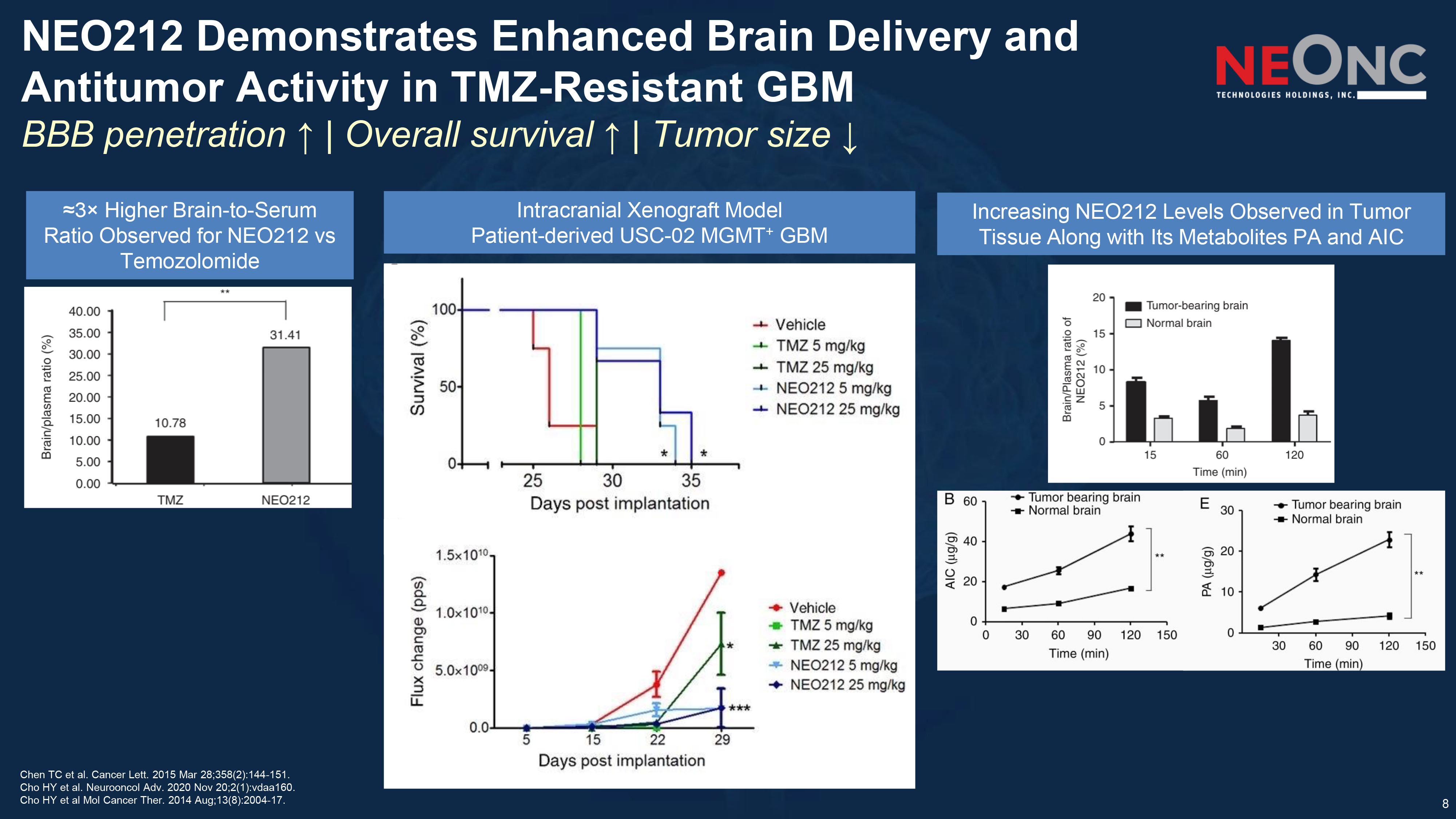 7 NEO212 Degrades MGMT and Overcomes TMZ Resistance in GBM Chen TC et al. Cancer Lett. 2015 Mar 28;358(2):144 - 151. Cho HY et al. Neurooncol Adv. 2020 Nov 20;2(1):vdaa160. Cho HY et al Mol Cancer Ther. 2014 Aug;13(8):2004 - 17. NEO212 Achieves Higher Intratumoral TMZ/AIC Exposure in TMZ - Resistant GBM NEO212 degrades MGMT and Kills TMZ - Resistant GBM Without the Need for MGMT Inhibitor O⁶BG NEO212 Demonstrates Greater Cytotoxicity Than Temozolomide in Human GBM Cell Lines