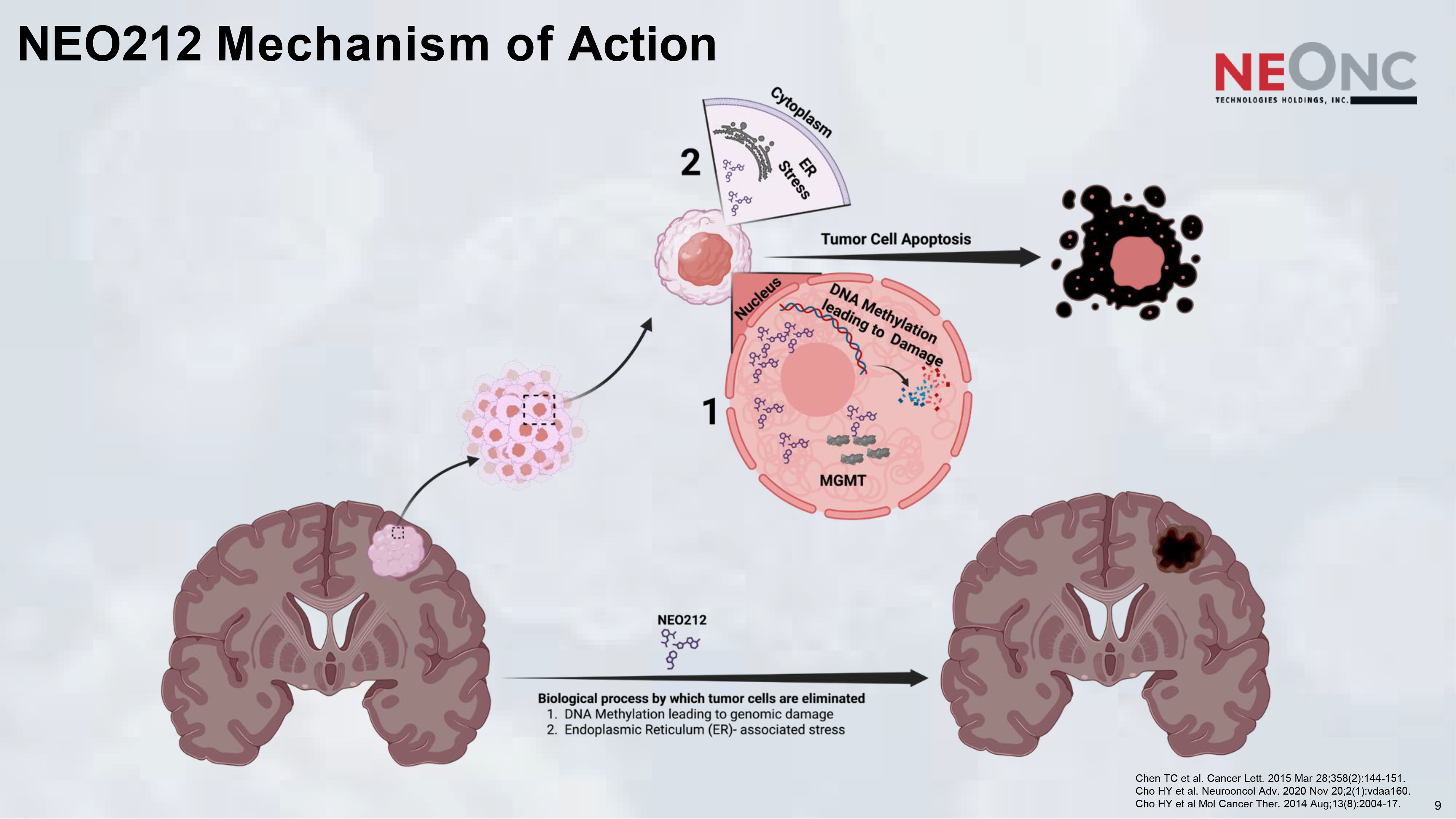 8 NEO212 Demonstrates Enhanced Brain Delivery and Antitumor Activity in TMZ - Resistant GBM BBB penetration ↑ | Overall survival ↑ | Tumor size ↓ Chen TC et al. Cancer Lett. 2015 Mar 28;358(2):144 - 151. Cho HY et al. Neurooncol Adv. 2020 Nov 20;2(1):vdaa160. Cho HY et al Mol Cancer Ther. 2014 Aug;13(8):2004 - 17. Intracranial Xenograft Model Patient - derived USC - 02 MGMT + GBM ≈3 î Higher Brain - to - Serum Ratio Observed for NEO212 vs Temozolomide Increasing NEO212 Levels Observed in Tumor Tissue Along with Its Metabolites PA and AIC