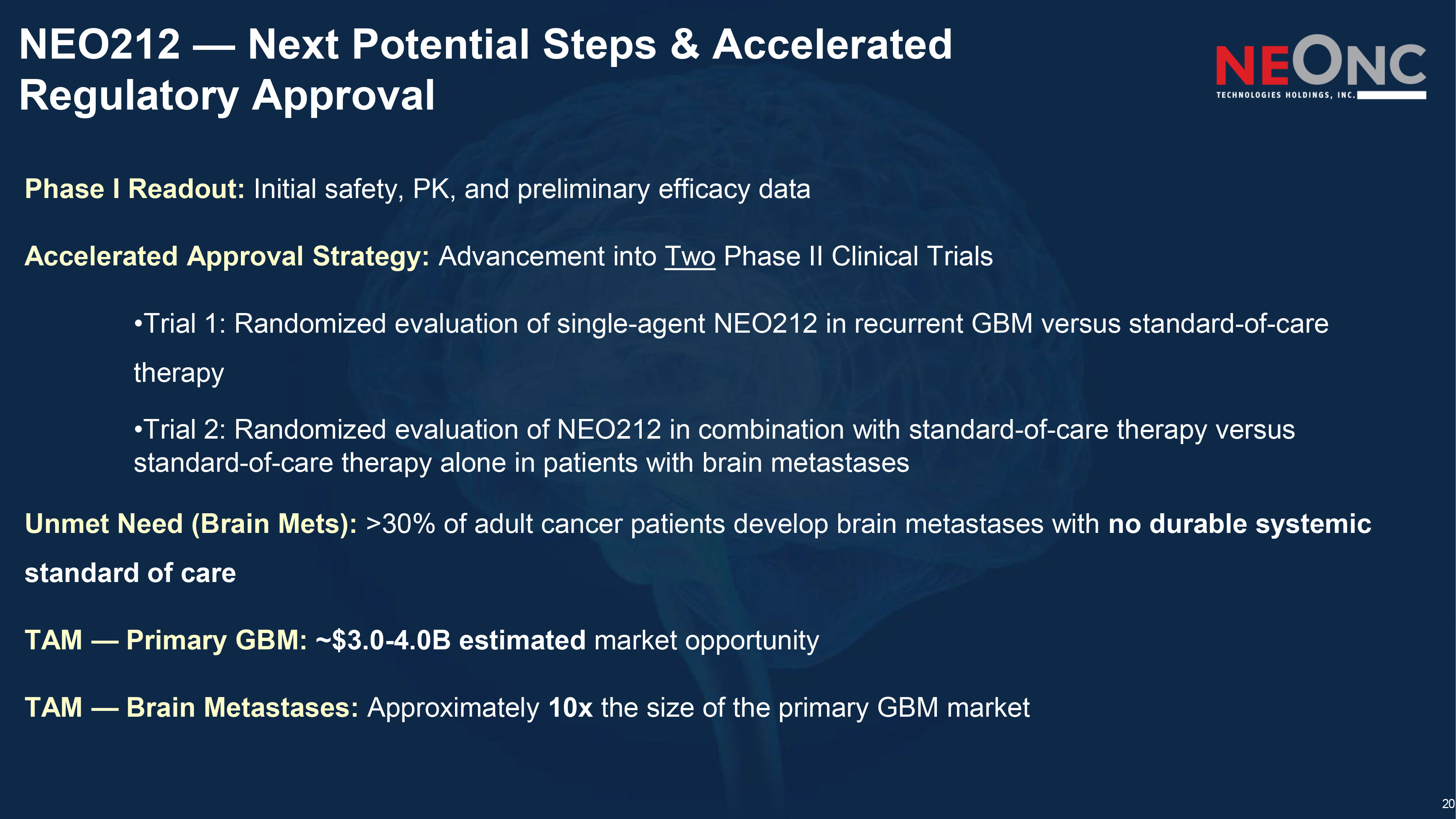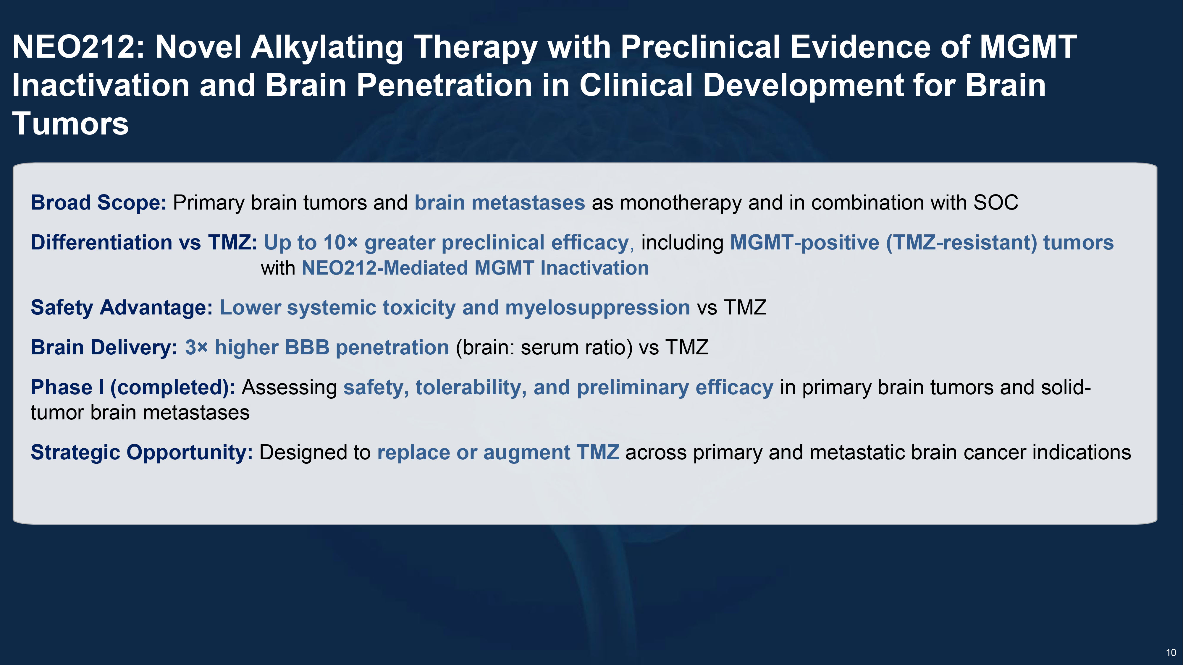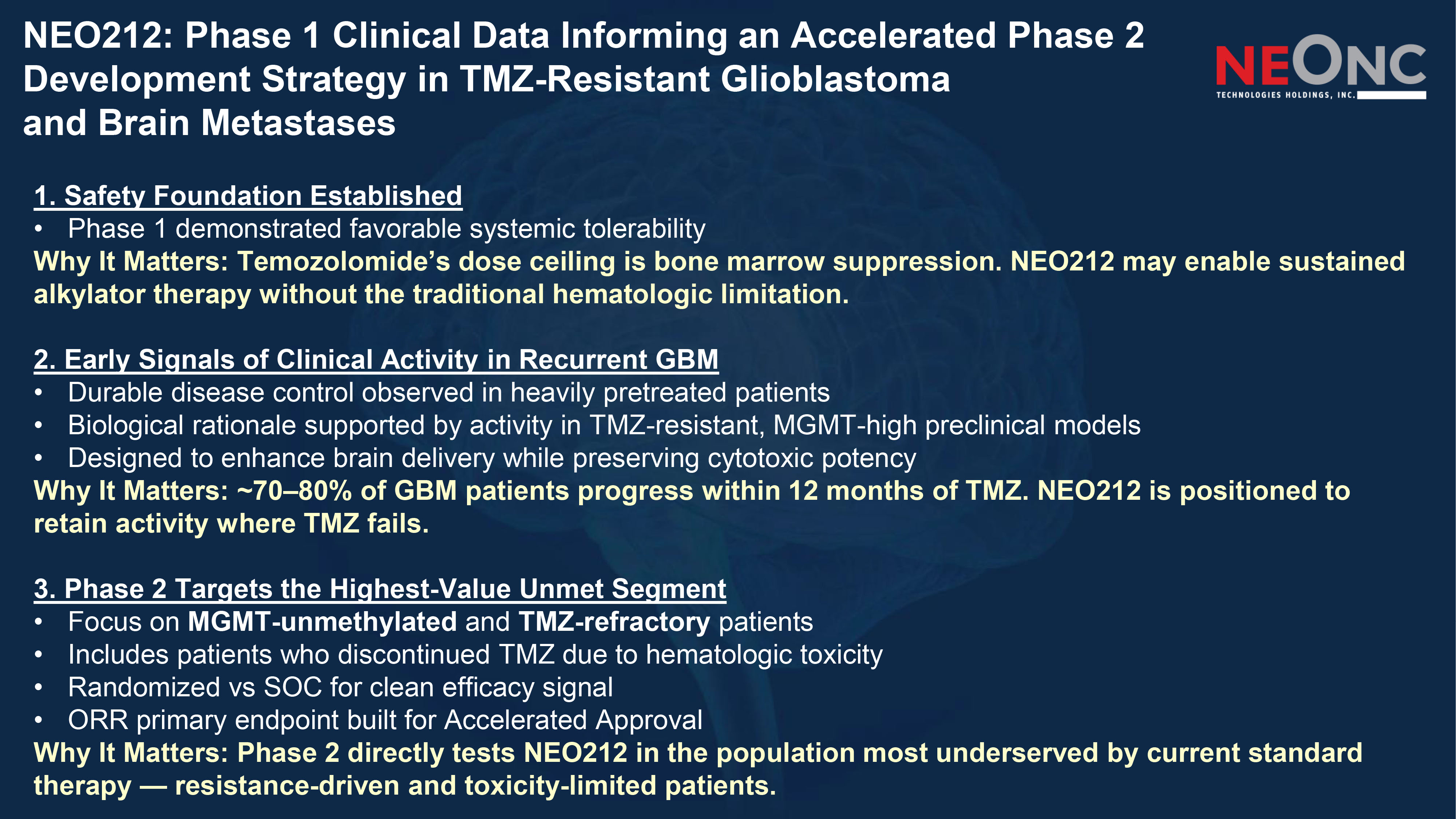 NEO212: Phase 1 Clinical Data Informing an Accelerated Phase 2 Development Strategy in TMZ - Resistant Glioblastoma and Brain Metastases 1. Safety Foundation Established • Phase 1 demonstrated favorable systemic tolerability Why It Matters: Temozolomide’s dose ceiling is bone marrow suppression. NEO212 may enable sustained alkylator therapy without the traditional hematologic limitation. 2. Early Signals of Clinical Activity in Recurrent GBM • Durable disease control observed in heavily pretreated patients • Biological rationale supported by activity in TMZ - resistant, MGMT - high preclinical models • Designed to enhance brain delivery while preserving cytotoxic potency Why It Matters: ~70 – 80% of GBM patients progress within 12 months of TMZ. NEO212 is positioned to retain activity where TMZ fails. 3. Phase 2 Targets the Highest - Value Unmet Segment • Focus on MGMT - unmethylated and TMZ - refractory patients • Includes patients who discontinued TMZ due to hematologic toxicity • Randomized vs SOC for clean efficacy signal • ORR primary endpoint built for Accelerated Approval Why It Matters: Phase 2 directly tests NEO212 in the population most underserved by current standard therapy — resistance - driven and toxicity - limited patients.