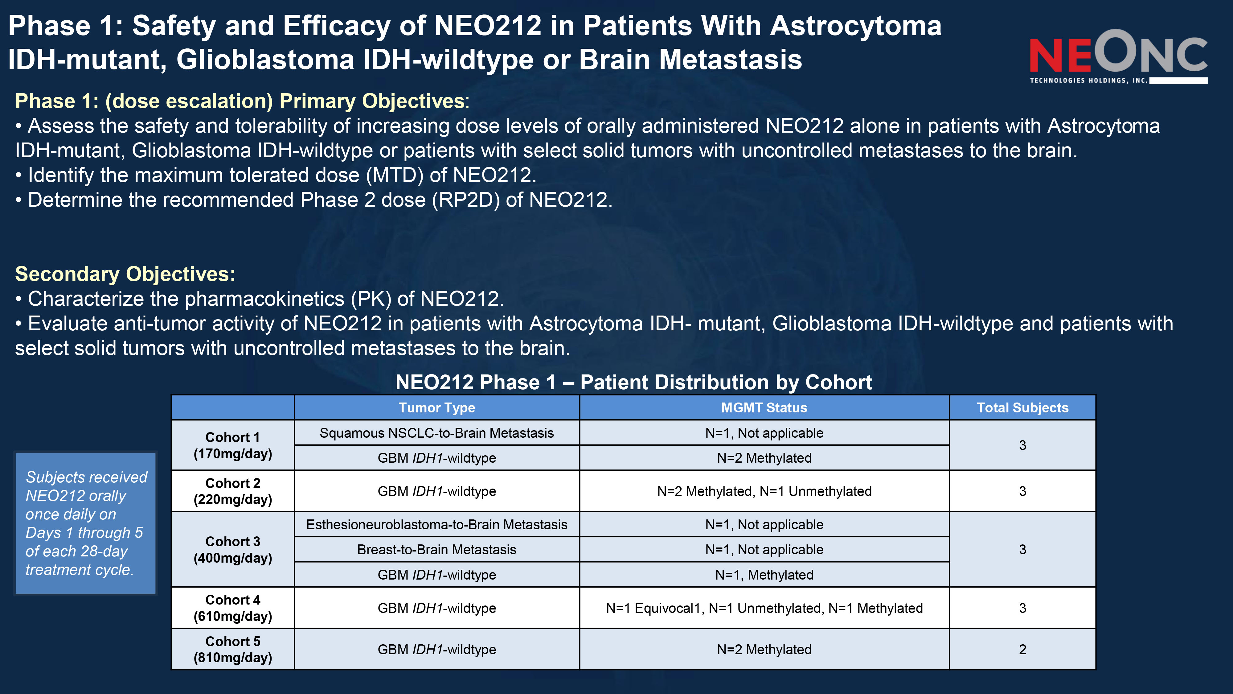 Phase 1: Safety and Efficacy of NEO212 in Patients With Astrocytoma IDH - mutant, Glioblastoma IDH - wildtype or Brain Metastasis Phase 1: (dose escalation) Primary Objectives : • Assess the safety and tolerability of increasing dose levels of orally administered NEO212 alone in patients with Astrocyto ma IDH - mutant, Glioblastoma IDH - wildtype or patients with select solid tumors with uncontrolled metastases to the brain. • Identify the maximum tolerated dose (MTD) of NEO212. • Determine the recommended Phase 2 dose (RP2D) of NEO212. Secondary Objectives: • Characterize the pharmacokinetics (PK) of NEO212. • Evaluate anti - tumor activity of NEO212 in patients with Astrocytoma IDH - mutant, Glioblastoma IDH - wildtype and patients with select solid tumors with uncontrolled metastases to the brain. Total Subjects MGMT Status Tumor Type 3 N=1, Not applicable Squamous NSCLC - to - Brain Metastasis Cohort 1 (170mg/day) N=2 Methylated GBM IDH1 - wildtype 3 N=2 Methylated, N=1 Unmethylated GBM IDH1 - wildtype Cohort 2 (220mg/day) 3 N=1, Not applicable Esthesioneuroblastoma - to - Brain Metastasis Cohort 3 (400mg/day) N=1, Not applicable Breast - to - Brain Metastasis N=1, Methylated GBM IDH1 - wildtype 3 N=1 Equivocal1, N=1 Unmethylated, N=1 Methylated GBM IDH1 - wildtype Cohort 4 (610mg/day) 2 N=2 Methylated GBM IDH1 - wildtype Cohort 5 (810mg/day) NEO212 Phase 1 – Patient Distribution by Cohort Subjects received NEO212 orally once daily on Days 1 through 5 of each 28 - day treatment cycle.