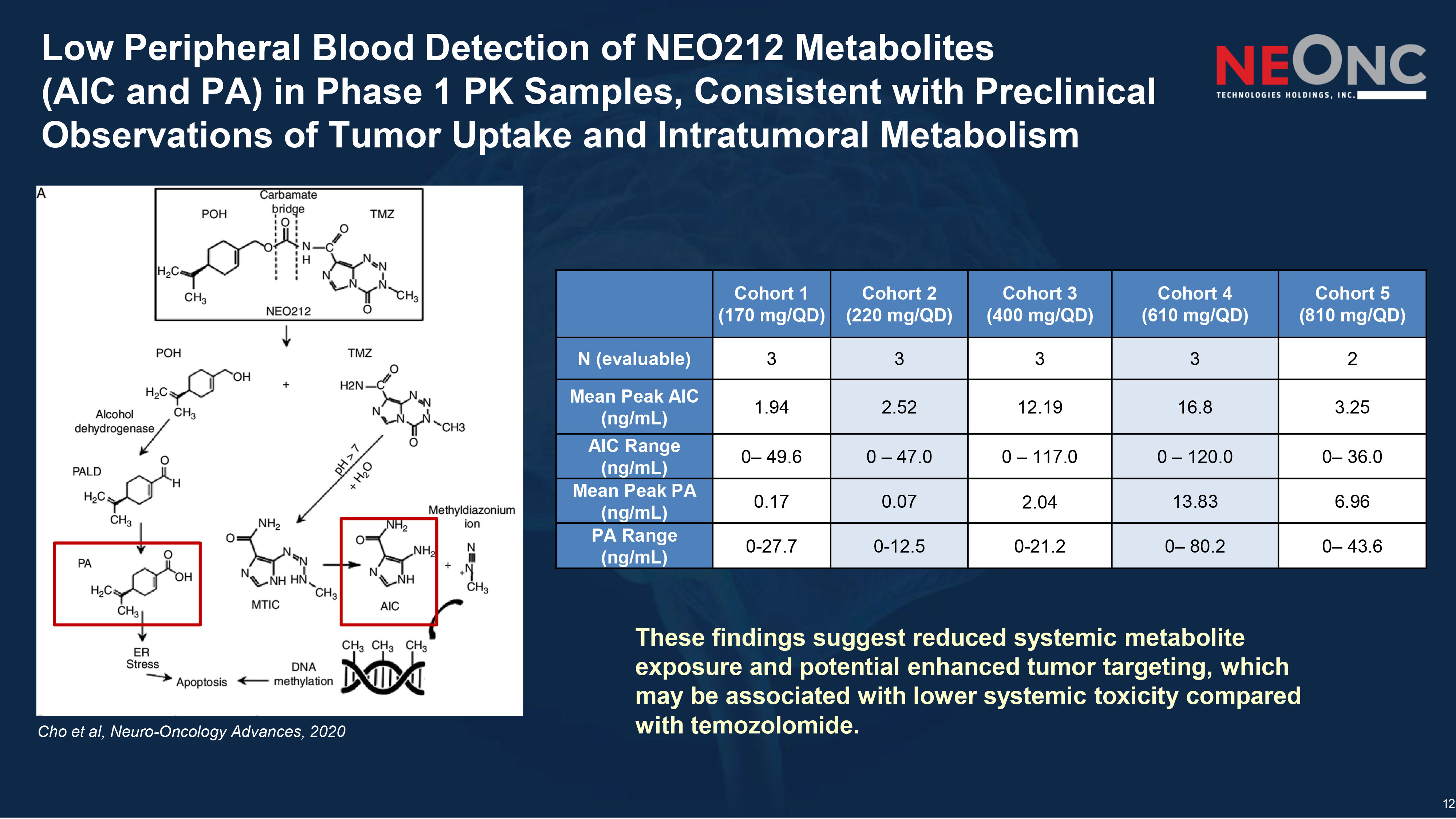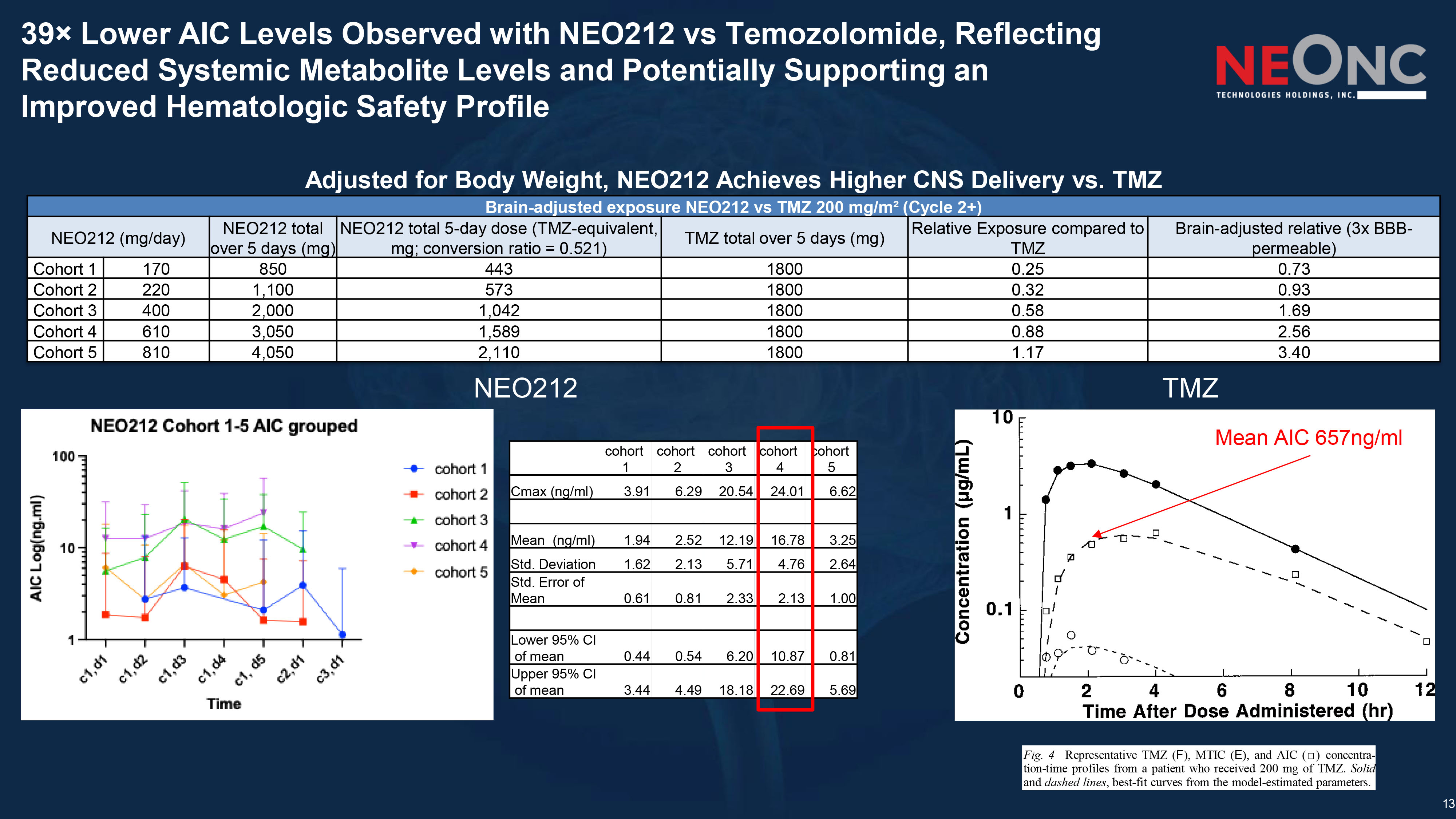 13 39 î Lower AIC Levels Observed with NEO212 vs Temozolomide, Reflecting Reduced Systemic Metabolite Levels and Potentially Supporting an Improved Hematologic Safety Profile Fig . 4 Representative TMZ ( F ), MTIC ( E ), and AIC ( Ƒ ) concentra - tion - time profiles from a patient who received 200 mg of TMZ . Solid and dashed lines , best - fit curves from the model - estimated parameters . NEO212 TMZ Brain - adjusted exposure NEO212 vs TMZ 200 mg/m² (Cycle 2+) Brain - adjusted relative (3x BBB - permeable) Relative Exposure compared to TMZ TMZ total over 5 days (mg) NEO212 total 5 - day dose (TMZ - equivalent, mg; conversion ratio = 0.521) NEO212 total over 5 days (mg) NEO212 (mg/day) 0.73 0.25 1800 443 850 170 Cohort 1 0.93 0.32 1800 573 1,100 220 Cohort 2 1.69 0.58 1800 1,042 2,000 400 Cohort 3 2.56 0.88 1800 1,589 3,050 610 Cohort 4 3.40 1.17 1800 2,110 4,050 810 Cohort 5 cohort 5 cohort 4 cohort 3 cohort 2 cohort 1 6.62 24.01 20.54 6.29 3.91 Cmax (ng/ml) 3.25 16.78 12.19 2.52 1.94 Mean (ng/ml) 2.64 4.76 5.71 2.13 1.62 Std. Deviation 1.00 2.13 2.33 0.81 0.61 Std. Error of Mean 0.81 10.87 6.20 0.54 0.44 Lower 95% CI of mean 5.69 22.69 18.18 4.49 3.44 Upper 95% CI of mean Mean AIC 657ng/ml Adjusted for Body Weight, NEO212 Achieves Higher CNS Delivery vs. TMZ