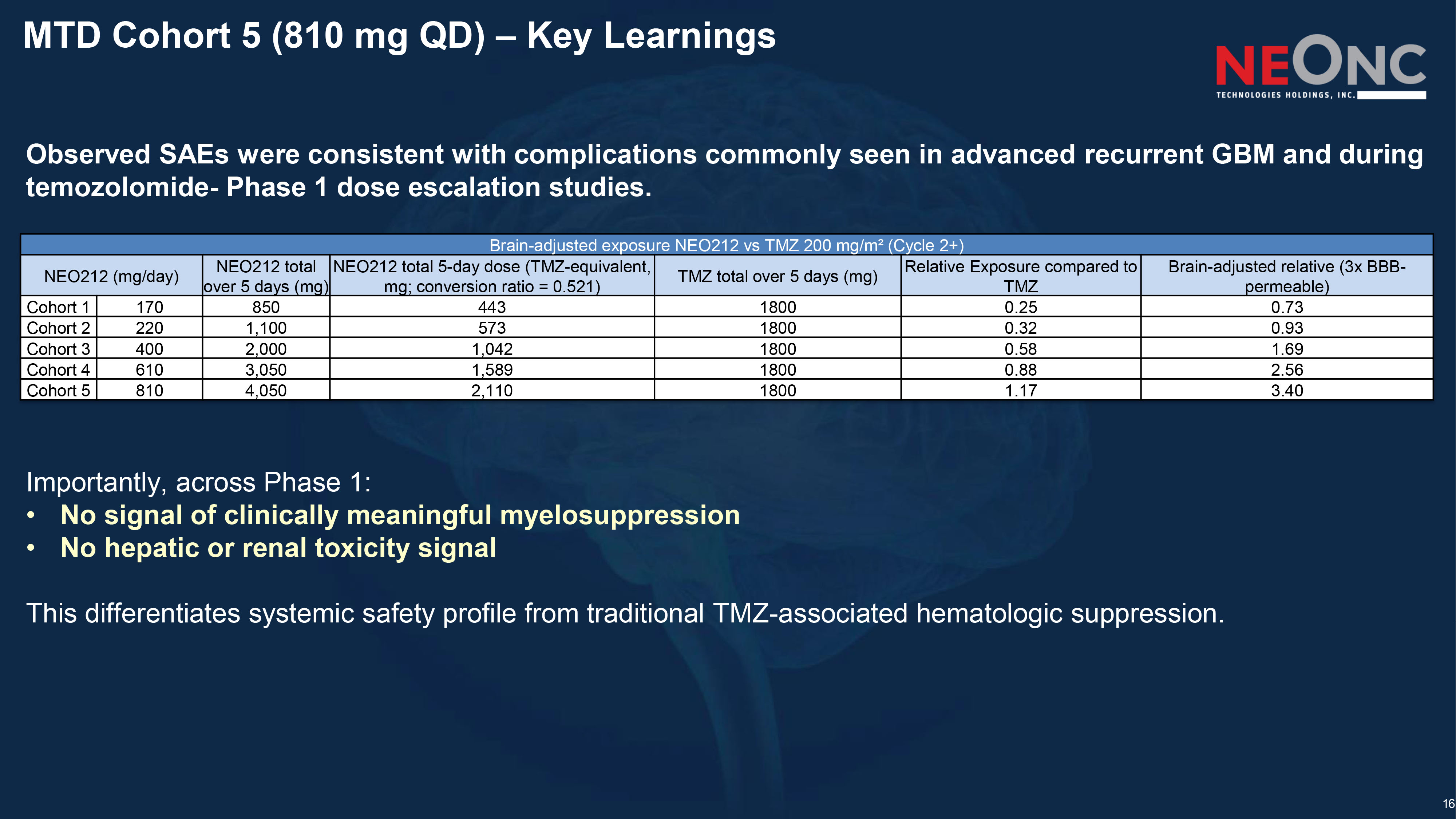 16 MTD Cohort 5 (810 mg QD) – Key Learnings Observed SAEs were consistent with complications commonly seen in advanced recurrent GBM and during temozolomide - Phase 1 dose escalation studies. Importantly, across Phase 1: • No signal of clinically meaningful myelosuppression • No hepatic or renal toxicity signal This differentiates systemic safety profile from traditional TMZ - associated hematologic suppression. Brain - adjusted exposure NEO212 vs TMZ 200 mg/m² (Cycle 2+) Brain - adjusted relative (3x BBB - permeable) Relative Exposure compared to TMZ TMZ total over 5 days (mg) NEO212 total 5 - day dose (TMZ - equivalent, mg; conversion ratio = 0.521) NEO212 total over 5 days (mg) NEO212 (mg/day) 0.73 0.25 1800 443 850 170 Cohort 1 0.93 0.32 1800 573 1,100 220 Cohort 2 1.69 0.58 1800 1,042 2,000 400 Cohort 3 2.56 0.88 1800 1,589 3,050 610 Cohort 4 3.40 1.17 1800 2,110 4,050 810 Cohort 5