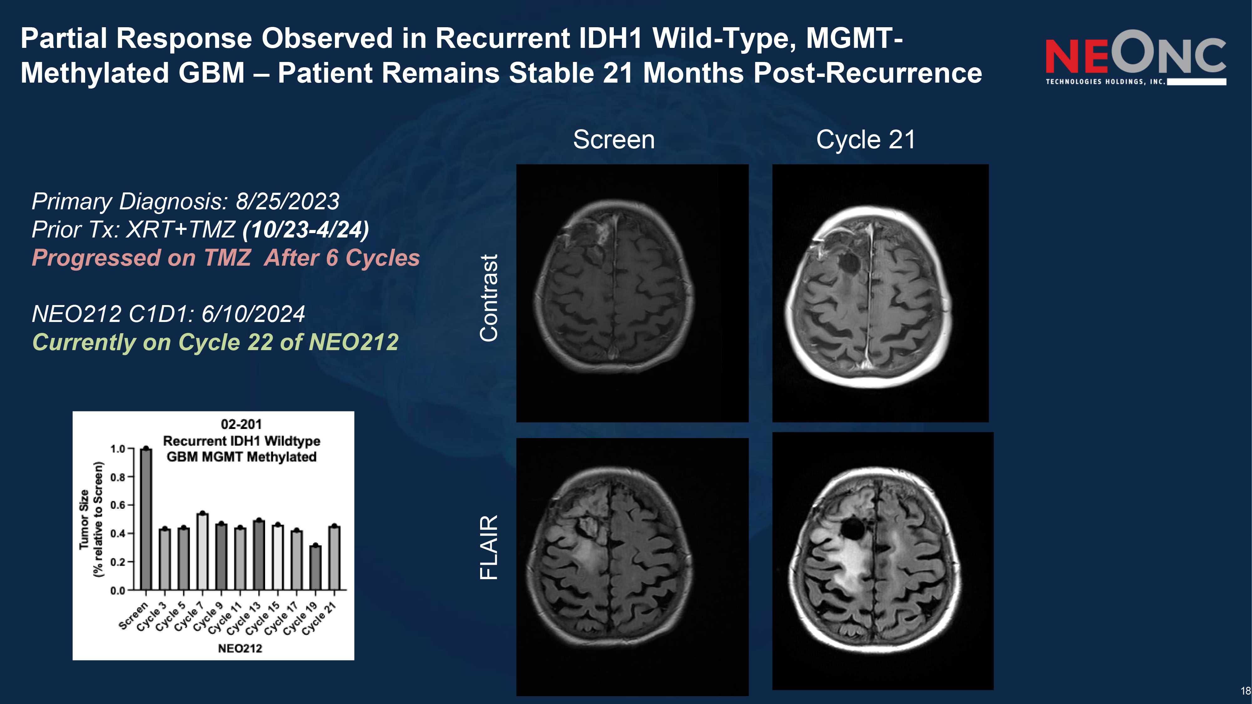 18 Partial Response Observed in Recurrent IDH1 Wild - Type, MGMT - Methylated GBM – Patient Remains Stable 21 Months Post - Recurrence Screen Cycle 21 Contrast FLAIR Primary Diagnosis: 8/25/2023 Prior Tx: XRT+TMZ (10/23 - 4/24) Progressed on TMZ After 6 Cycles NEO212 C1D1: 6/10/2024 Currently on Cycle 22 of NEO212