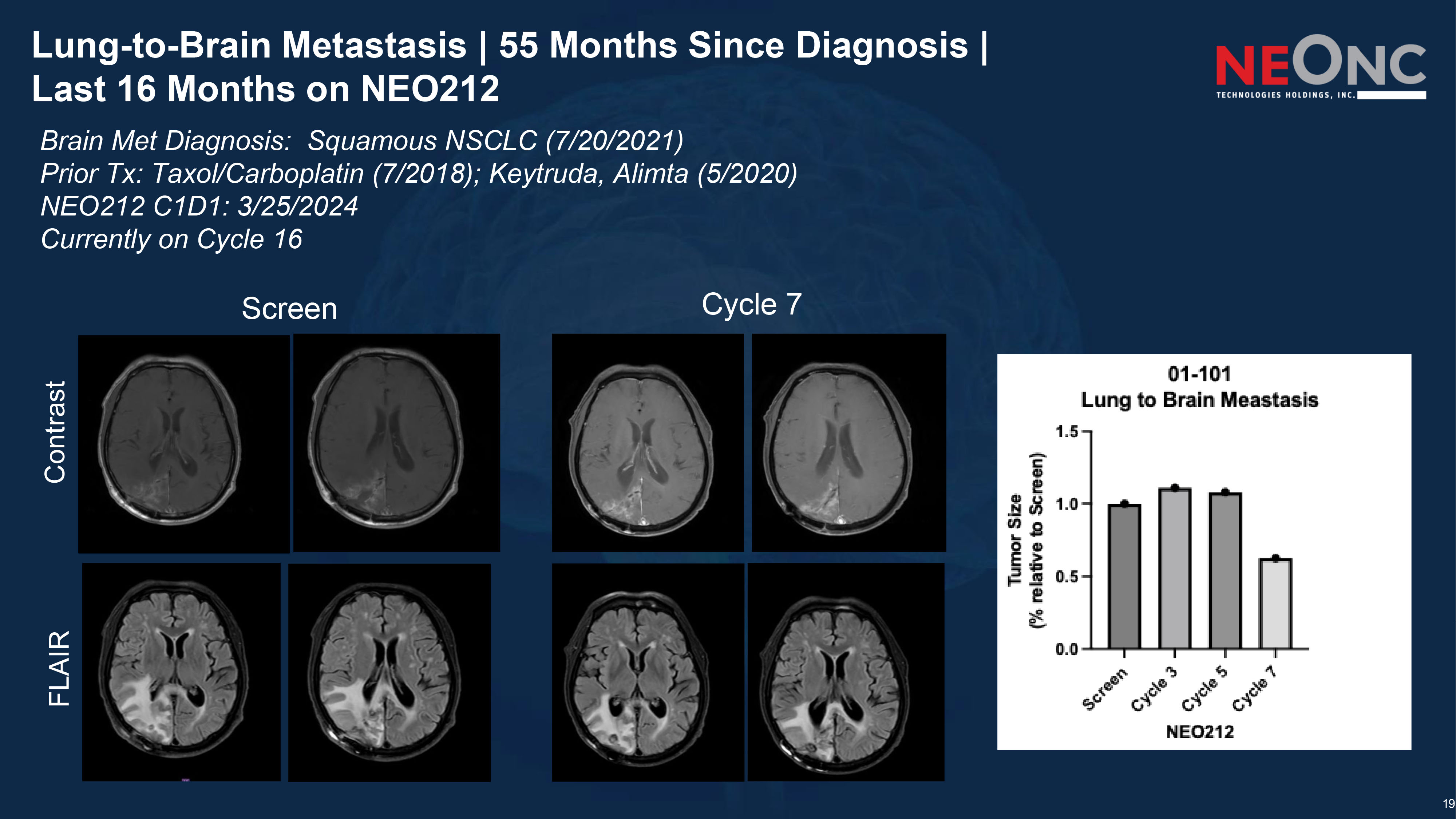 19 Lung - to - Brain Metastasis | 55 Months Since Diagnosis | Last 16 Months on NEO212 Screen Cycle 7 Contrast FLAIR Brain Met Diagnosis: Squamous NSCLC (7/20/2021) Prior Tx: Taxol/Carboplatin (7/2018); Keytruda, Alimta (5/2020) NEO212 C1D1: 3/25/2024 Currently on Cycle 16