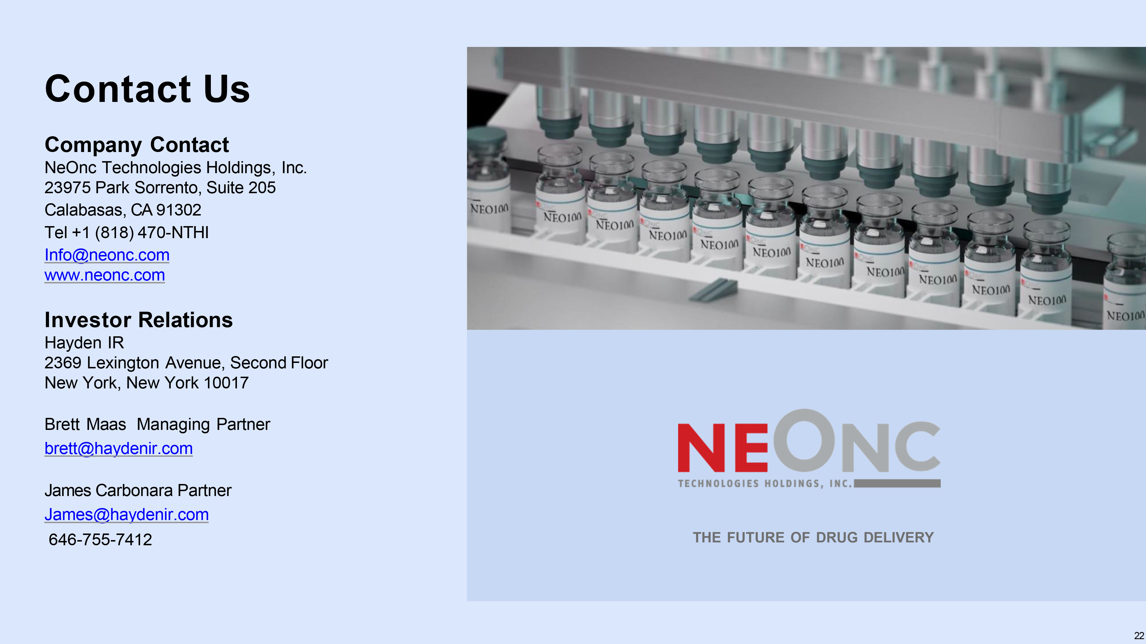 THE FUTURE OF DRUG DELIVERY Company Contact NeOnc Technologies Holdings, Inc. 23975 Park Sorrento , Suite 205 Calabasas, CA 91302 Tel +1 (818) 470 - NTHI Info@neonc.com www.neonc.com Investor Relations Hayden IR 2369 Lexington Avenue , Second Floor New York, New York 10017 Brett Maas Managing Partner brett@haydenir.com James Carbonara Partner James@haydenir.com 646 - 755 - 7412 Contact Us 22