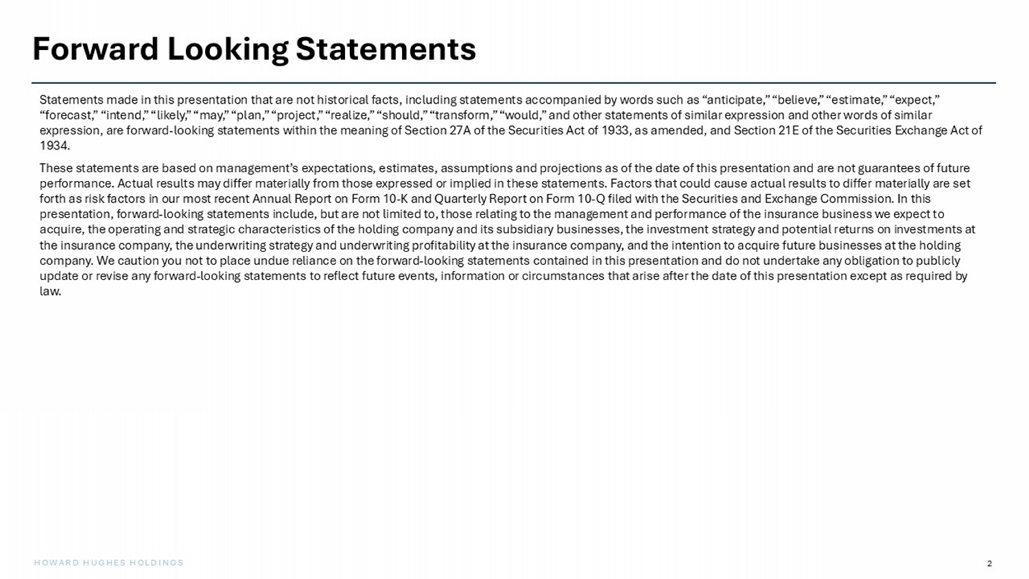 2 HOWARD HUGHES HOLDINGS Forward Looking Statements Statements made in this presentation that are not historical facts, including statements accompanied by words such as “antici pat e,” “believe,” “estimate,” “expect,” “forecast,” “intend,” “likely,” “may,” “plan,” “project,” “realize,” “should,” “transform,” “would,” and other statements of sim ilar expression and other words of similar expression, are forward - looking statements within the meaning of Section 27A of the Securities Act of 1933, as amended, and Sect ion 21E of the Securities Exchange Act of 1934. These statements are based on management’s expectations, estimates, assumptions and projections as of the date of this presen tat ion and are not guarantees of future performance. Actual results may differ materially from those expressed or implied in these statements. Factors that could cau se actual results to differ materially are set forth as risk factors in our most recent Annual Report on Form 10 - K and Quarterly Report on Form 10 - Q filed with the Securities and Exchange Commission. In this presentation, forward - looking statements include, but are not limited to, those relating to the management and performance of th e insurance business we expect to acquire, the operating and strategic characteristics of the holding company and its subsidiary businesses, the investment str ate gy and potential returns on investments at the insurance company, the underwriting strategy and underwriting profitability at the insurance company, and the intention t o a cquire future businesses at the holding company. We caution you not to place undue reliance on the forward - looking statements contained in this presentation and do not undertake any obligation to publicly update or revise any forward - looking statements to reflect future events, information or circumstances that arise after the date of this presentation except as required by law.
