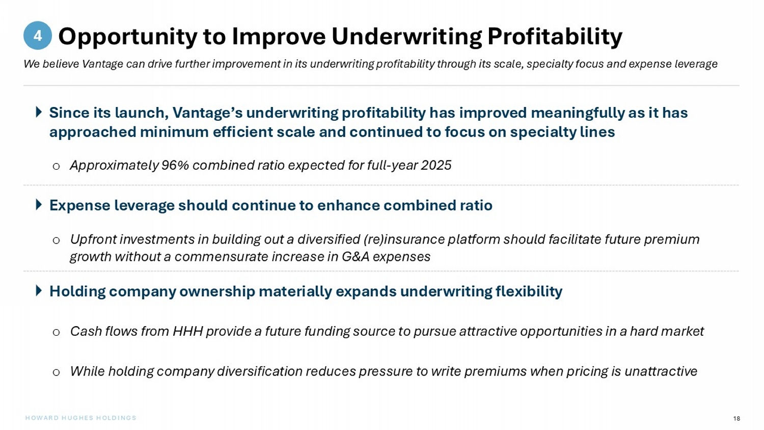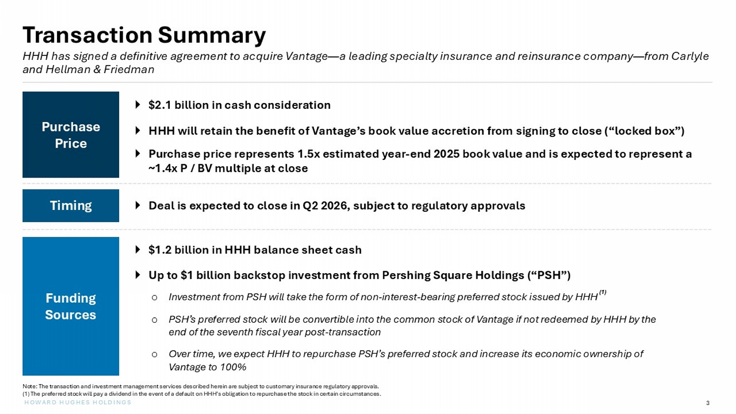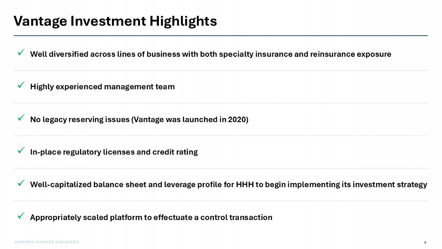 3 HOWARD HUGHES HOLDINGS Transaction Summary $2.1 billion in cash consideration HHH will retain the benefit of Vantage’s book value accretion from signing to close (“locked box”) Purchase price represents 1.5x estimated year - end 2025 book value and is expected to represent a ~1.4x P / BV multiple at close HHH has signed a definitive agreement to acquire Vantage — a leading specialty insurance and reinsurance company — from Carlyle and Hellman & Friedman Purchase Price Deal is expected to close in Q2 2026, subject to regulatory approvals Timing $1.2 billion in HHH balance sheet cash Up to $1 billion backstop investment from Pershing Square Holdings (“PSH”) o Investment from PSH will take the form of non - interest - bearing preferred stock issued by HHH o PSH’s preferred stock will be convertible into the common stock of Vantage if not redeemed by HHH by the end of the seventh fiscal year post - transaction o Over time, we expect HHH to repurchase PSH’s preferred stock and increase its economic ownership of Vantage to 100% Funding Sources Note: The transaction and investment management services described herein are subject to customary insurance regulatory appro val s. (1) The preferred stock will pay a dividend in the event of a default on HHH’s obligation to repurchase the stock in certain cir cumstances. ( 1 )