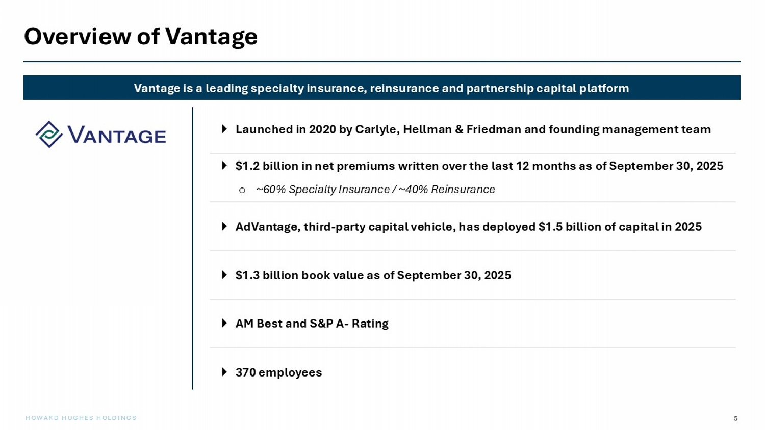 4 HOWARD HUGHES HOLDINGS Vantage Investment Highlights x Well diversified across lines of business with both specialty insurance and reinsurance exposure x Highly experienced management team x No legacy reserving issues (Vantage was launched in 2020) x In - place regulatory licenses and credit rating x Well - capitalized balance sheet and leverage profile for HHH to begin implementing its investment strategy x Appropriately scaled platform to effectuate a control transaction