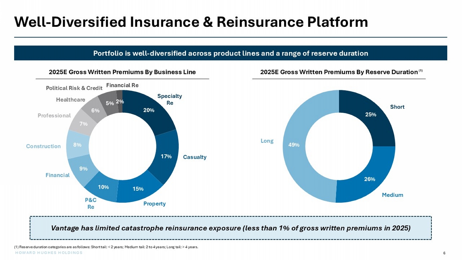 6 HOWARD HUGHES HOLDINGS Well - Diversified Insurance & Reinsurance Platform Portfolio is well - diversified across product lines and a range of reserve duration Vantage has limited catastrophe reinsurance exposure (less than 1% of gross written premiums in 2025) 2025E Gross Written Premiums By Business Line 2025E Gross Written Premiums By Reserve Duration Short Medium Long 20% 17% 15% 10% 9% 8% 7% 6% 5% 2% Specialty Re Casualty Property P&C Re Financial Construction Professional Healthcare Political Risk & Credit Financial Re (1) Reserve duration categories are as follows: Short tail: < 2 years; Medium tail: 2 to 4 years; Long tail: > 4 years. ( 1 ) 25% 26% 49%