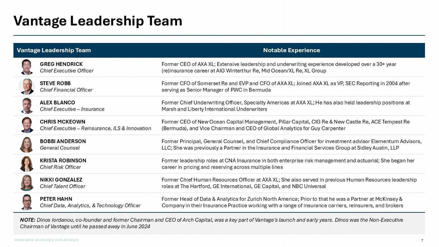7 HOWARD HUGHES HOLDINGS Vantage Leadership Team NOTE: Dinos Iordanou, co - founder and former Chairman and CEO of Arch Capital, was a key part of Vantage’s launch and early years. Dino s was the Non - Executive Chairman of Vantage until he passed away in June 2024 Notable Experience Vantage Leadership Team Former CEO of AXA XL; Extensive leadership and underwriting experience developed over a 30+ year (re)insurance career at AIG Winterthur Re, Mid Ocean/XL Re, XL Group GREG HENDRICK Chief Executive Officer Former CFO of Somerset Re and EVP and CFO of AXA XL; Joined AXA XL as VP, SEC Reporting in 2004 after serving as Senior Manager of PWC in Bermuda STEVE ROBB Chief Financial Officer Former Chief Underwriting Officer, Specialty Americas at AXA XL; He has also held leadership positions at Marsh and Liberty International Underwriters ALEX BLANCO Chief Executive – Insurance Former CEO of New Ocean Capital Management, Pillar Capital, CIG Re & New Castle Re, ACE Tempest Re (Bermuda), and Vice Chairman and CEO of Global Analytics for Guy Carpenter CHRIS MCKEOWN Chief Executive – Reinsurance, ILS & Innovation Former Principal, General Counsel, and Chief Compliance Officer for investment advisor Elementum Advisors, LLC; She was previously a Partner in the Insurance and Financial Services Group at Sidley Austin, LLP BOBBI ANDERSON General Counsel Former leadership roles at CNA Insurance in both enterprise risk management and actuarial; She began her career in pricing and reserving across multiple lines KRISTA ROBINSON Chief Risk Officer Former Chief Human Resources Officer at AXA XL; She also served in previous Human Resources leadership roles at The Hartford, GE International, GE Capital, and NBC Universal NIKKI GONZALEZ Chief Talent Officer Former Head of Data & Analytics for Zurich North America; Prior to that he was a Partner at McKinsey & Company in their Insurance Practice working with a range of insurance carriers, reinsurers, and brokers PETER HAHN Chief Data, Analytics, & Technology Officer