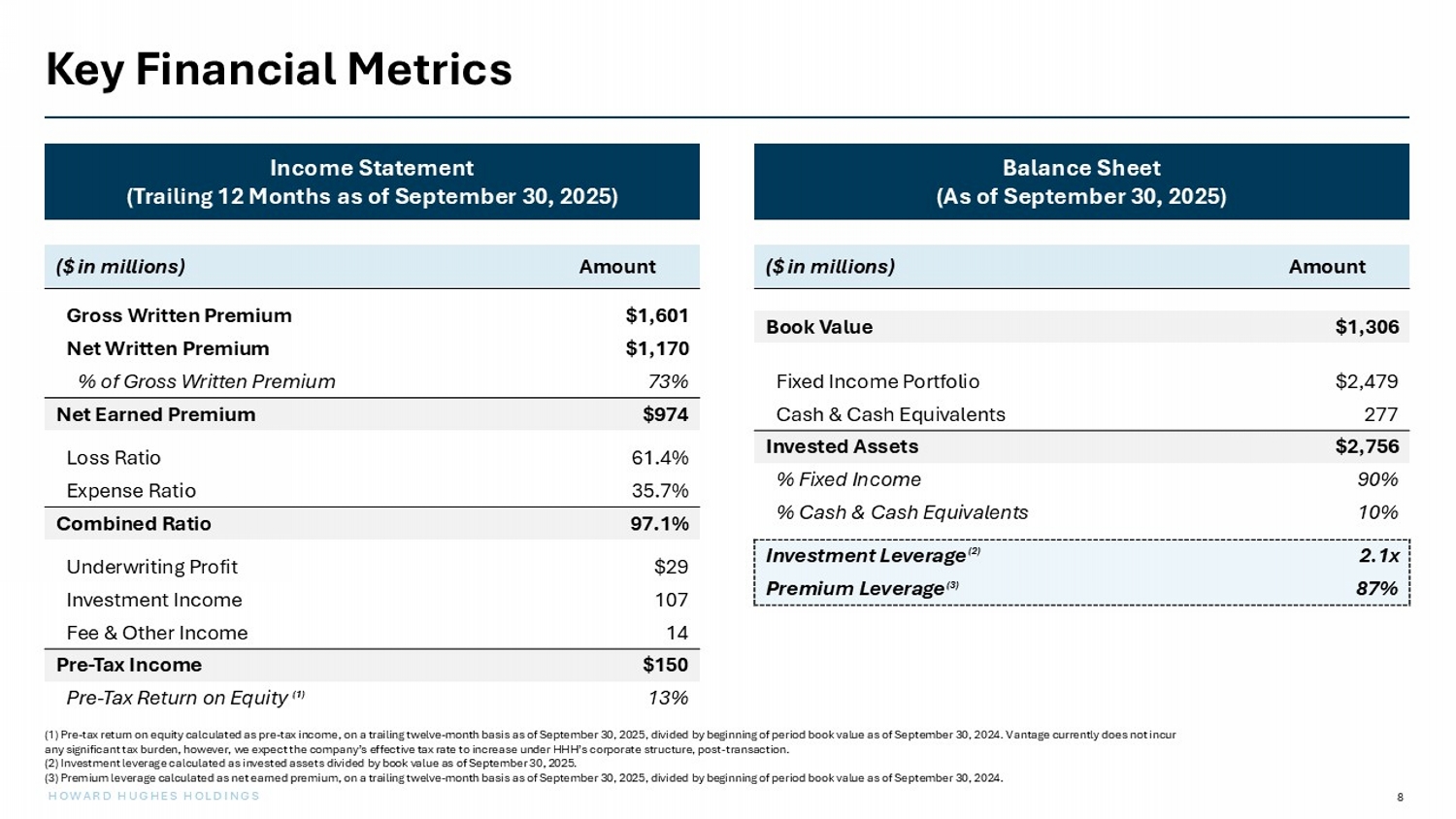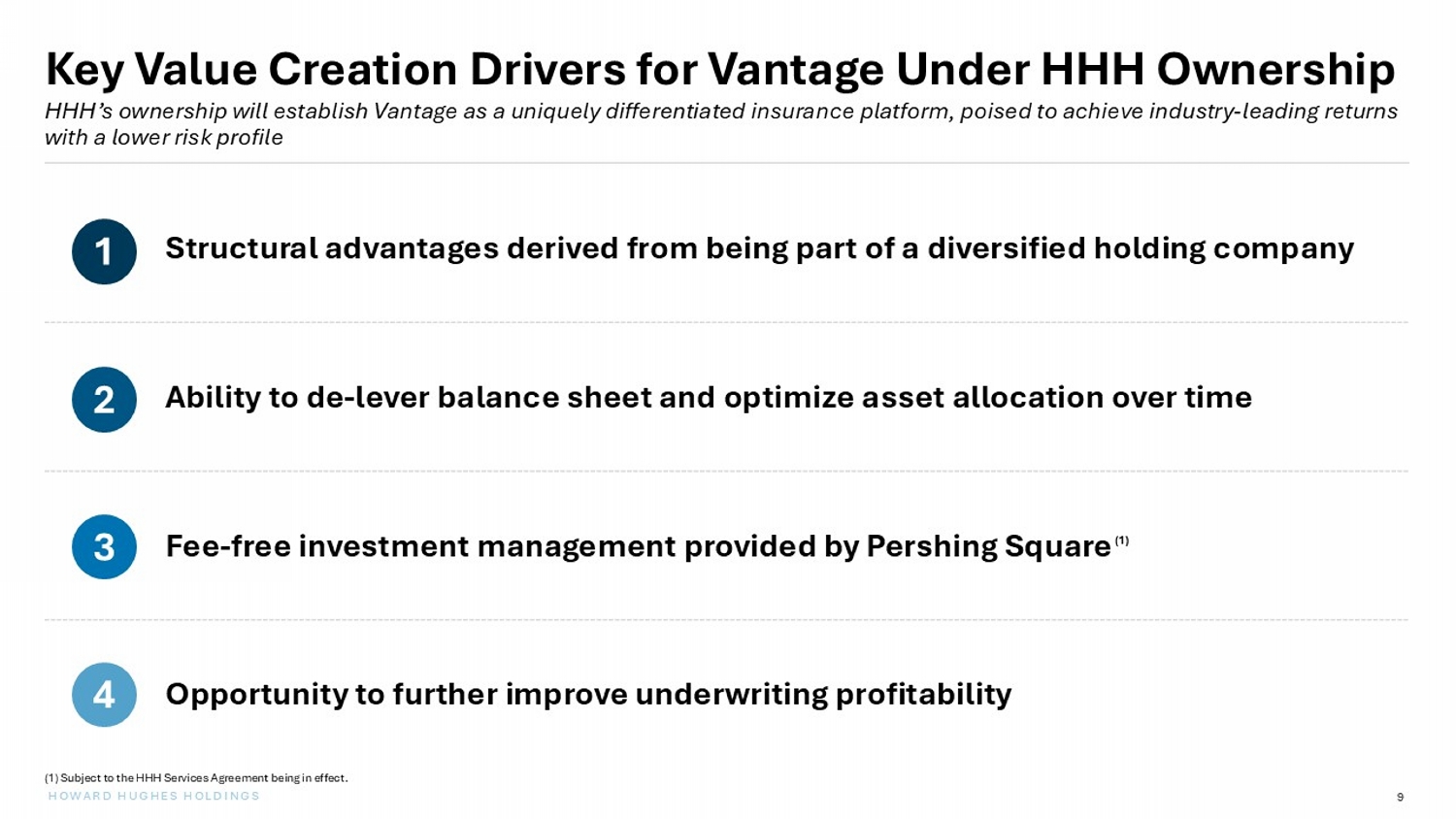8 HOWARD HUGHES HOLDINGS Key Financial Metrics Income Statement (Trailing 12 Months as of September 30, 2025) Balance Sheet (As of September 30, 2025) Amount ($ in millions) $1,306 Book Value $2,479 Fixed Income Portfolio 277 Cash & Cash Equivalents $2,756 Invested Assets 90% % Fixed Income 10% % Cash & Cash Equivalents 2.1x Investment Leverage 87% Premium Leverage Amount ($ in millions) $1,601 Gross Written Premium $1,170 Net Written Premium 73% % of Gross Written Premium $974 Net Earned Premium 61.4% Loss Ratio 35.7% Expense Ratio 97.1% Combined Ratio $29 Underwriting Profit 107 Investment Income 14 Fee & Other Income $150 Pre - Tax Income 13% Pre - Tax Return on Equity (1) Pre - tax return on equity calculated as pre - tax income, on a trailing twelve - month basis as of September 30, 2025, divided by beginning of period book value as of September 30, 2024. V antage currently does not incur any significant tax burden, however, we expect the company’s effective tax rate to increase under HHH’s corporate structure, pos t - transaction. (2) Investment leverage calculated as invested assets divided by book value as of September 30, 2025. (3) Premium leverage calculated as net earned premium, on a trailing twelve - month basis as of September 30, 2025, divided by beginni ng of period book value as of September 30, 2024. ( 1 ) ( 2 ) ( 3 )