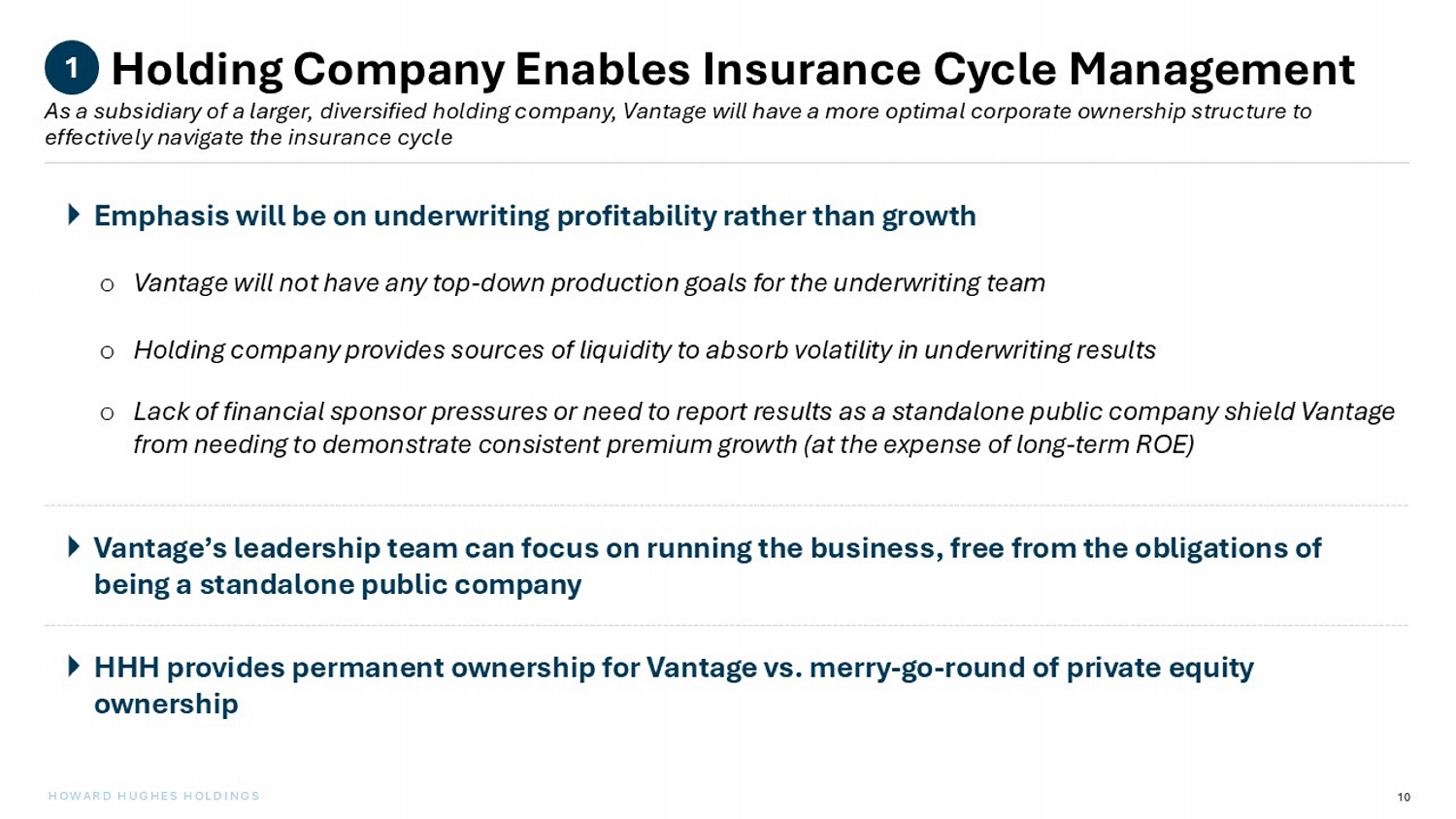 9 HOWARD HUGHES HOLDINGS Key Value Creation Drivers for Vantage Under HHH Ownership HHH’s ownership will establish Vantage as a uniquely differentiated insurance platform, poised to achieve industry - leading retur ns with a lower risk profile Structural advantages derived from being part of a diversified holding company Ability to de - lever balance sheet and optimize asset allocation over time Fee - free investment management provided by Pershing Square Opportunity to further improve underwriting profitability 1 2 3 4 (1) Subject to the HHH Services Agreement being in effect. ( 1 )