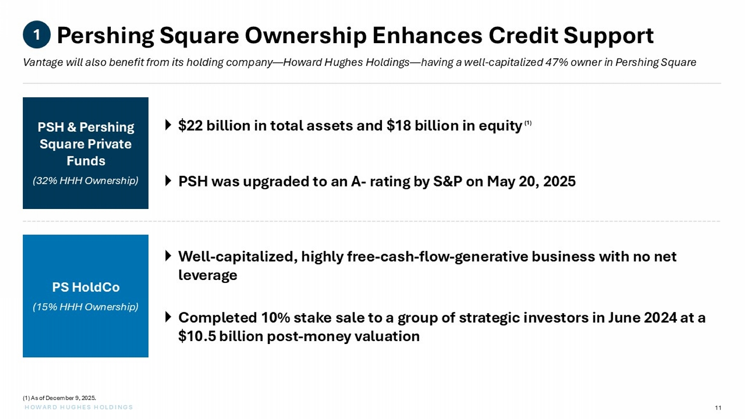 11 HOWARD HUGHES HOLDINGS Pershing Square Ownership Enhances Credit Support Vantage will also benefit from its holding company — Howard Hughes Holdings — having a well - capitalized 47% owner in Pershing Square Well - capitalized, highly free - cash - flow - generative business with no net leverage Completed 10% stake sale to a group of strategic investors in June 2024 at a $10.5 billion post - money valuation PS HoldCo (15% HHH Ownership) $22 billion in total assets and $18 billion in equity PSH was upgraded to an A - rating by S&P on May 20, 2025 PSH & Pershing Square Private Funds (32% HHH Ownership) 1 (1) As of December 9, 2025. ( 1 )