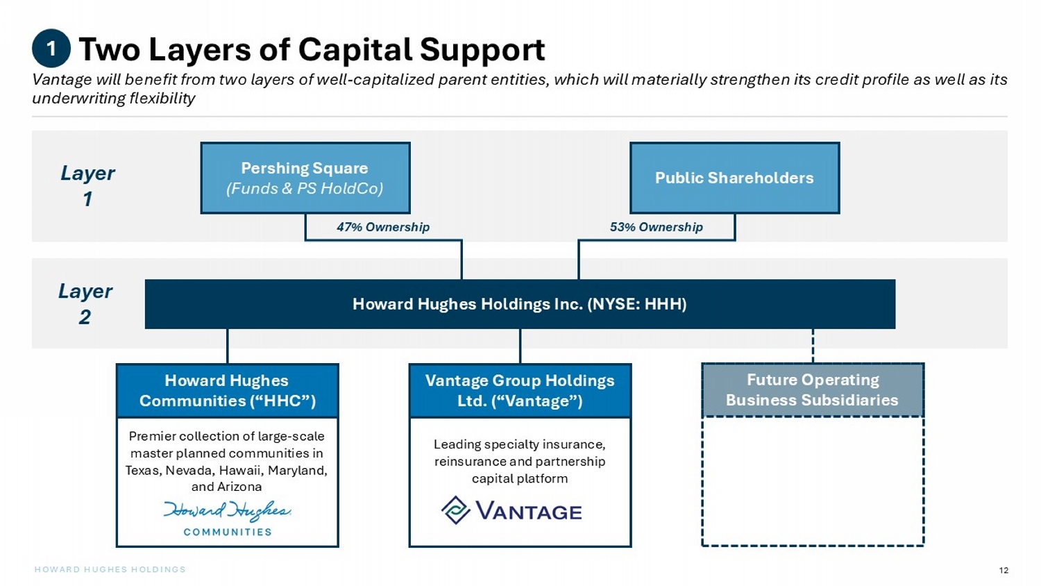 12 HOWARD HUGHES HOLDINGS Premier collection of large - scale master planned communities in Texas, Nevada, Hawaii, Maryland, and Arizona Two Layers of Capital Support 1 Pershing Square (Funds & PS HoldCo) Public Shareholders Howard Hughes Holdings Inc. (NYSE: HHH) Howard Hughes Communities (“HHC”) Leading specialty insurance, reinsurance and partnership capital platform Vantage Group Holdings Ltd. (“Vantage”) Future Operating Business Subsidiaries 47% Ownership 53% Ownership Layer 1 Layer 2 Vantage will benefit from two layers of well - capitalized parent entities, which will materially strengthen its credit profile as well as its underwriting flexibility