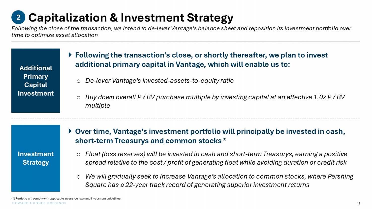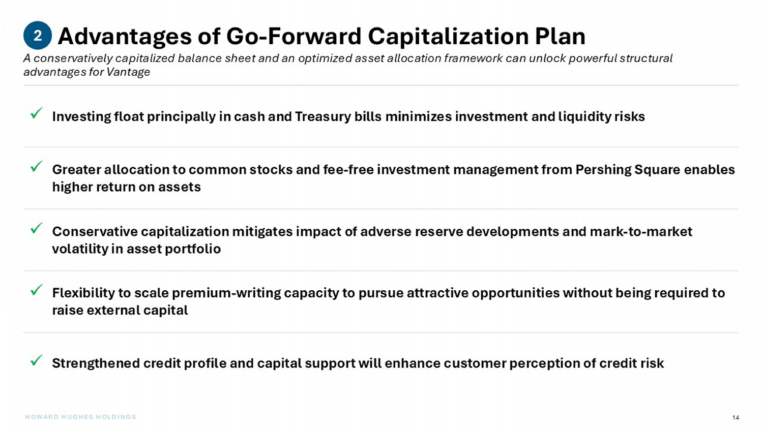 13 HOWARD HUGHES HOLDINGS Capitalization & Investment Strategy Following the close of the transaction, we intend to de - lever Vantage’s balance sheet and reposition its investment portfolio ov er time to optimize asset allocation 2 Over time, Vantage’s investment portfolio will principally be invested in cash, short - term Treasurys and common stocks o Float (loss reserves) will be invested in cash and short - term Treasurys, earning a positive spread relative to the cost / profit of generating float while avoiding duration or credit risk o We will gradually seek to increase Vantage’s allocation to common stocks, where Pershing Square has a 22 - year track record of generating superior investment returns Investment Strategy Following the transaction’s close, or shortly thereafter, we plan to invest additional primary capital in Vantage, which will enable us to: o De - lever Vantage’s invested - assets - to - equity ratio o Buy down overall P / BV purchase multiple by investing capital at an effective 1.0x P / BV multiple Additional Primary Capital Investment (1) Portfolio will comply with applicable insurance laws and investment guidelines. ( 1 )