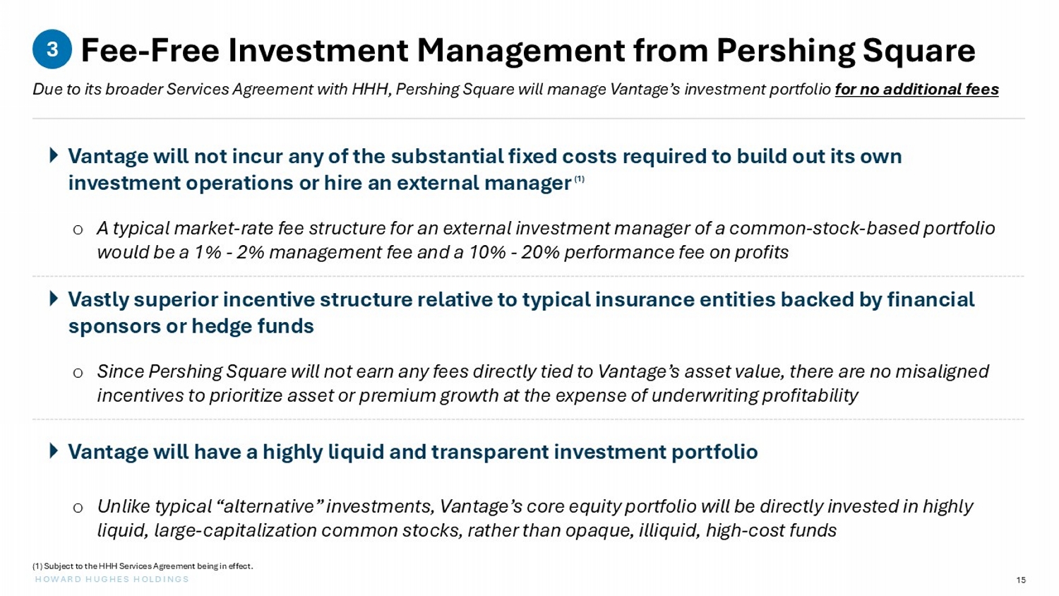 14 HOWARD HUGHES HOLDINGS Advantages of Go - Forward Capitalization Plan A conservatively capitalized balance sheet and an optimized asset allocation framework can unlock powerful structural advantages for Vantage 2 x Investing float principally in cash and Treasury bills minimizes investment and liquidity risks x Greater allocation to common stocks and fee - free investment management from Pershing Square enables higher return on assets x Conservative capitalization mitigates impact of adverse reserve developments and mark - to - market volatility in asset portfolio x Flexibility to scale premium - writing capacity to pursue attractive opportunities without being required to raise external capital x Strengthened credit profile and capital support will enhance customer perception of credit risk