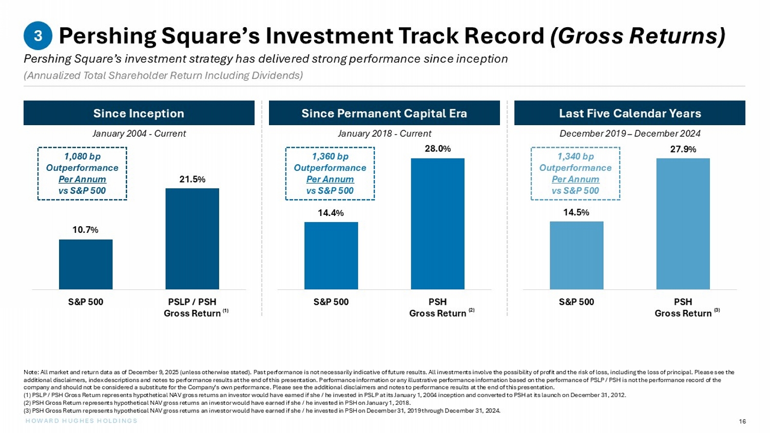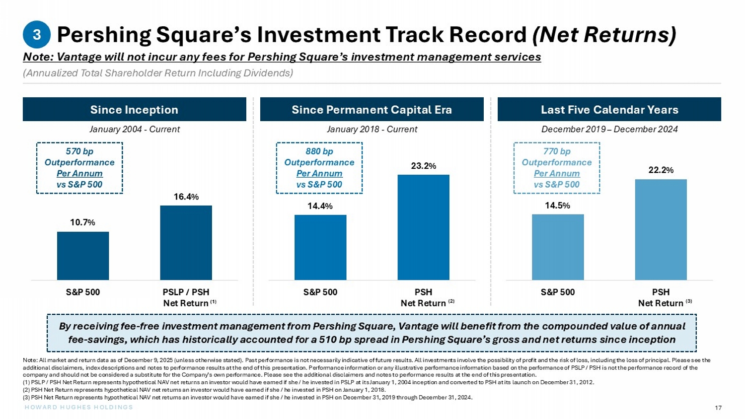 16 HOWARD HUGHES HOLDINGS Pershing Square’s Investment Track Record (Gross Returns) Pershing Square’s investment strategy has delivered strong performance since inception 3 Note: All market and return data as of December 9, 2025 (unless otherwise stated). Past performance is not necessarily indica tiv e of future results. All investments involve the possibility of profit and the risk of loss, including the loss of principal. Pl ease see the additional disclaimers, index descriptions and notes to performance results at the end of this presentation. Performance info rma tion or any illustrative performance information based on the performance of PSLP / PSH is not the performance record of the company and should not be considered a substitute for the Company’s own performance. Please see the additional disclaimers an d n otes to performance results at the end of this presentation. (1) PSLP / PSH Gross Return represents hypothetical NAV gross returns an investor would have earned if she / he invested in PSLP at its January 1, 2004 inception and converted to PSH at its launch on December 31, 2012. (2) PSH Gross Return represents hypothetical NAV gross returns an investor would have earned if she / he invested in PSH on Janua ry 1, 2018. (3) PSH Gross Return represents hypothetical NAV gross returns an investor would have earned if she / he invested in PSH on Decem ber 31, 2019 through December 31, 2024. Since Inception Last Five Calendar Years Since Permanent Capital Era January 2018 - Current January 2004 - Current December 2019 – December 2024 (Annualized Total Shareholder Return Including Dividends) ( 1 ) ( 2 ) ( 3 ) 10.7% 21.5% S&P 500 PSLP / PSH Gross Return 14.4% 28.0% S&P 500 PSH Gross Return 14.5% 27.9% S&P 500 PSH Gross Return 1,080 bp Outperformance Per Annum vs S&P 500 1,360 bp Outperformance Per Annum vs S&P 500 1,340 bp Outperformance Per Annum vs S&P 500