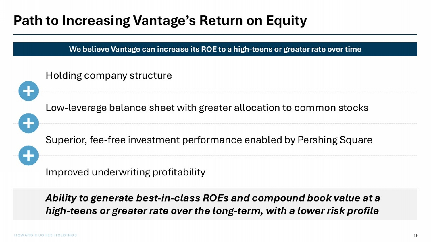 18 HOWARD HUGHES HOLDINGS Opportunity to Improve Underwriting Profitability We believe Vantage can drive further improvement in its underwriting profitability through its scale, specialty focus and exp ens e leverage 4 Since its launch, Vantage’s underwriting profitability has improved meaningfully as it has approached minimum efficient scale and continued to focus on specialty lines o Approximately 96% combined ratio expected for full - year 2025 Expense leverage should continue to enhance combined ratio o Upfront investments in building out a diversified (re)insurance platform should facilitate future premium growth without a commensurate increase in G&A expenses Holding company ownership materially expands underwriting flexibility o Cash flows from HHH provide a future funding source to pursue attractive opportunities in a hard market o While holding company diversification reduces pressure to write premiums when pricing is unattractive