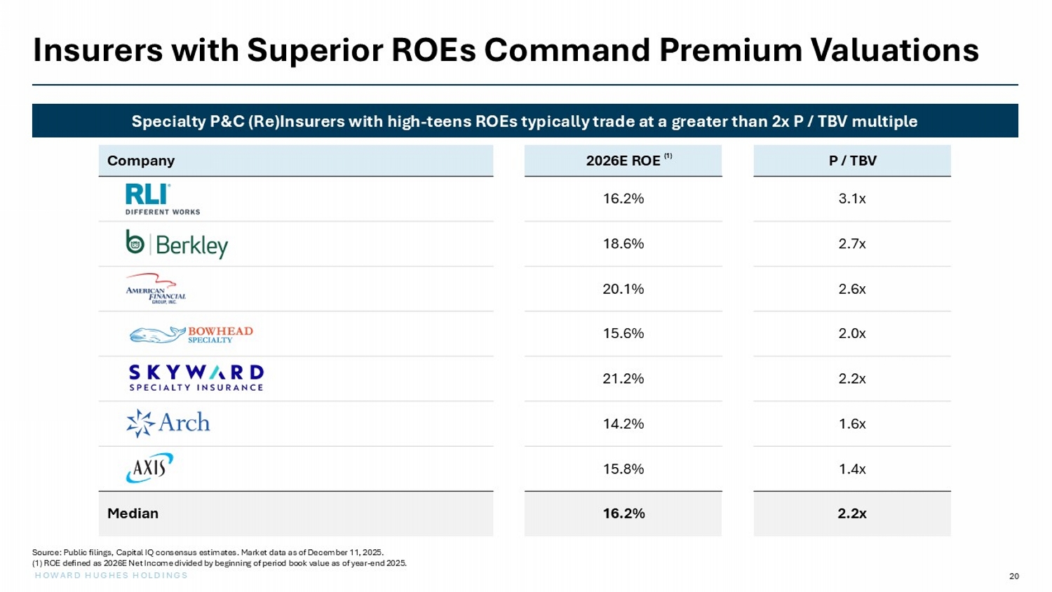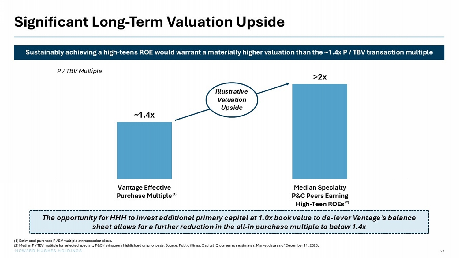 20 HOWARD HUGHES HOLDINGS Insurers with Superior ROEs Command Premium Valuations Specialty P&C (Re)Insurers with high - teens ROEs typically trade at a greater than 2x P / TBV multiple P / TBV 2026E ROE Company 3.1x 16.2% 2.7x 18.6% 2.6x 20.1% 2.0x 15.6% 2.2x 21.2% 1.6x 14.2% 1.4x 15.8% 2.2x 16.2% Median Source: Public filings, Capital IQ consensus estimates. Market data as of December 11, 2025. (1) ROE defined as 2026E Net Income divided by beginning of period book value as of year - end 2025. ( 1 )
